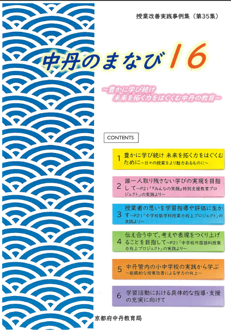 <内容> pdfデータ 1 豊かに学び続き 未来を拓く力をはぐくむために~日々の授業をより魅力あるもに~ 2 誰一人取り残さない学びの実現を目指して~P21「『みんなの笑顔』特別支援教育プロジェクト」の実践より~ 3 授業者の思いを学習指導や評価に生かす~P21「中学校数学科授業力向上プロジェクト」の実践より~ 4 伝え合う中で、考えや表現をつくり上げることを目指して~P21「中学校外国語科授業力向上プロジェクト」の実践より~ 5 中丹管内の小中学校の実践から学ぶ~組織的な授業改善による学力の向上~ 6 学習活動における具体的な指導・支援の充実に向けて