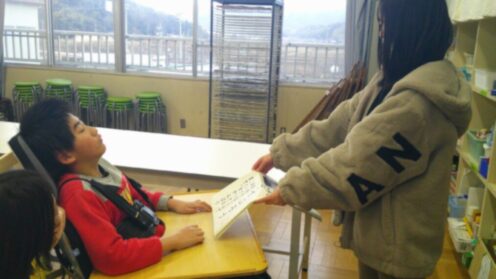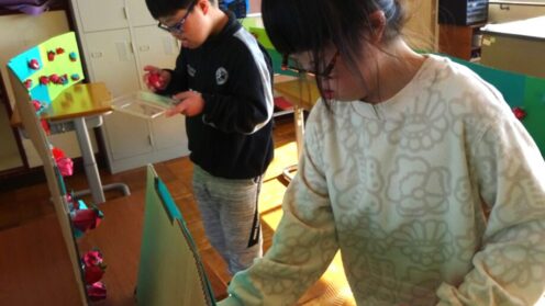 高等部7組では、国語で百人一首の調べ学習を実施しました。その中で、お気に入りの和歌を決め、拡大した札を作成しました。四季を感じさせる色合いに和紙を折り染めし、乾いたものをちぎって歌人の着物部分に貼り付けました。生徒たちは、歌人を立体に見...
