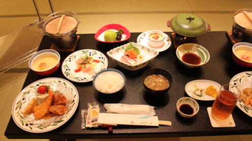 2日目の夕食までのまったりタイムはそれぞれの部屋で過ごしました。ある部屋ではトランプの真剣勝負で大盛り上がり。 その後は夕食。今日も豪華な食事でした。何から食べようか迷いながら、おいしくいただきました。毎食、おなかがいっぱいになりすぎて...