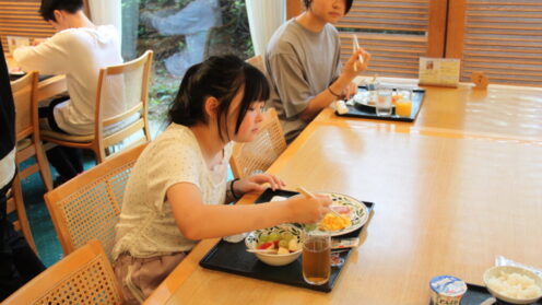 3日目(最終日)がスタートしました。今日はテーマパークおやつタウンで体験をする予定です。 まずは朝食。今朝もバイキングを楽しみました。昨日経験しているので、みんなどんどん自分で食べたいものを選んで食べていました。