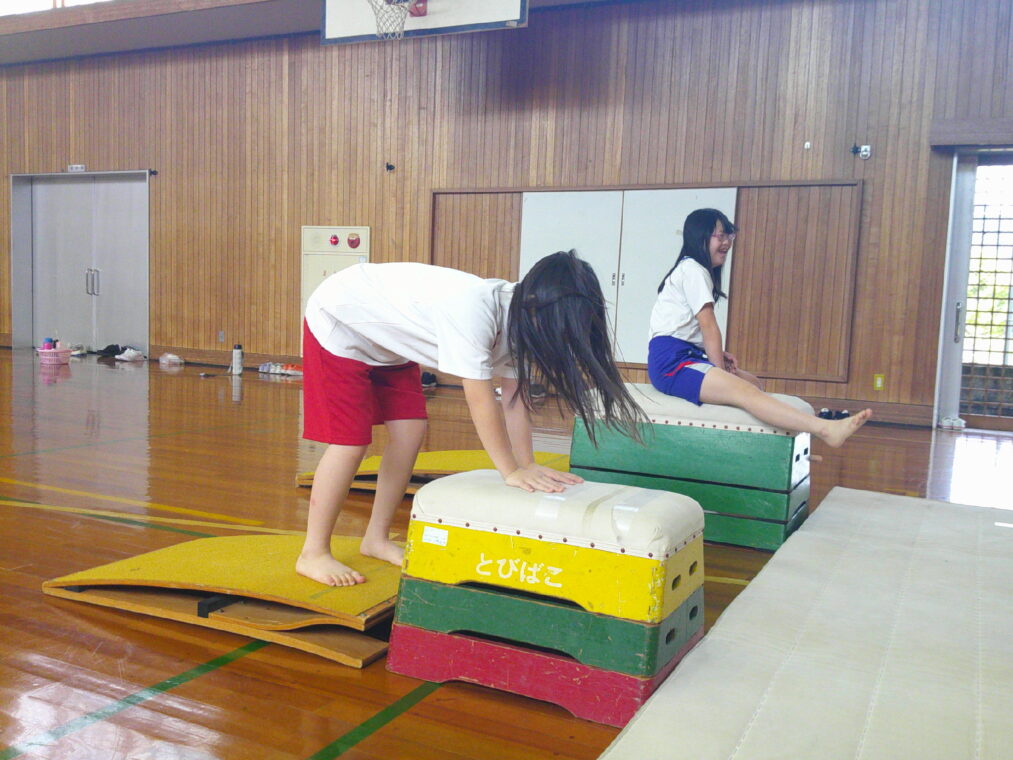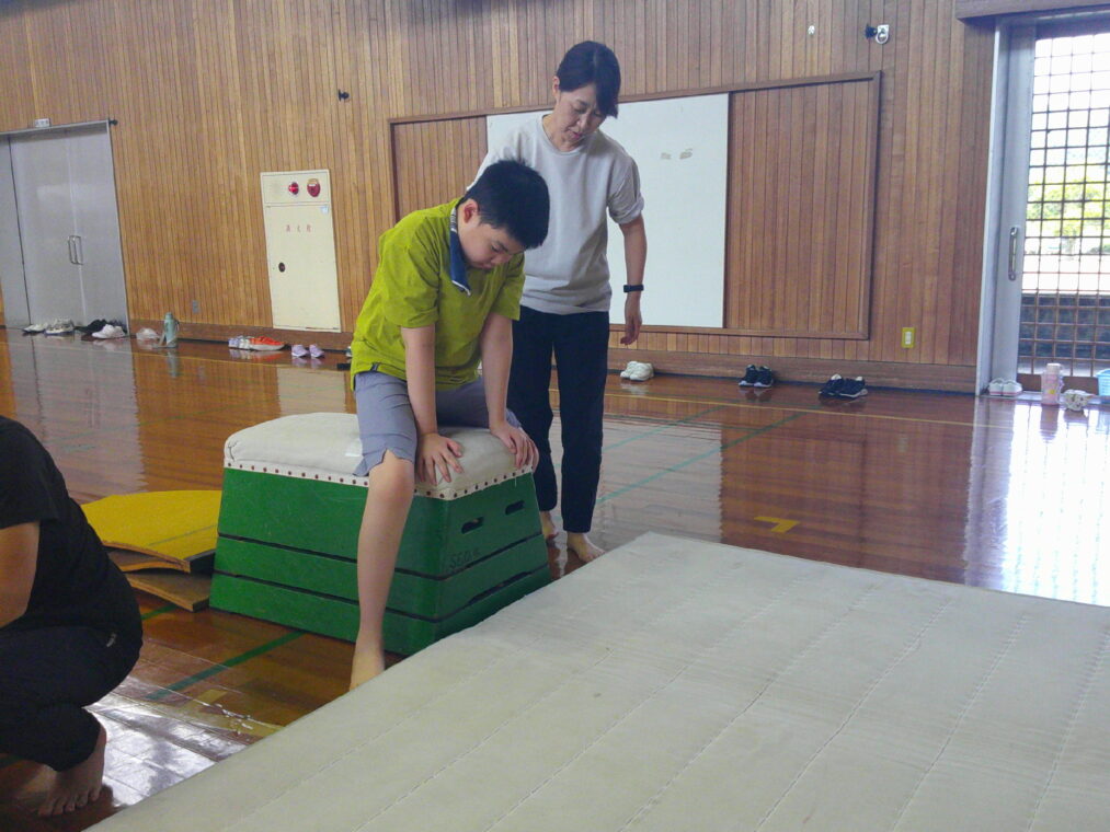 小学部4・5・8・9組では、器械・器具を使った運動に取り組んでいます。跳び箱では、またぎながら体重移動をする児童や、5段を跳び越える児童など、それぞれの力に合わせて挑戦しています。また、マット運動では手押し車を行い、ペースを合わせながら進むことができています。
