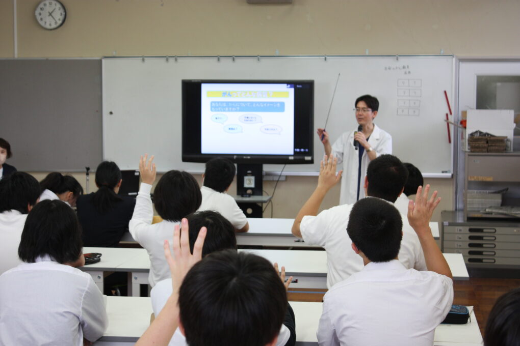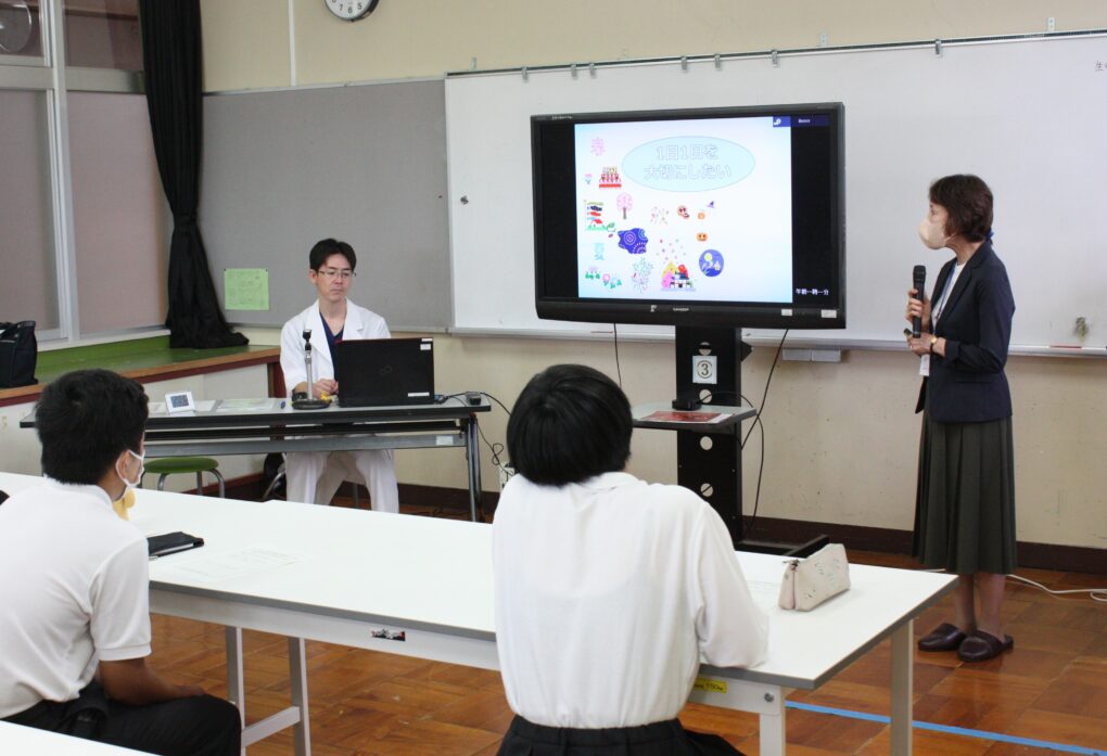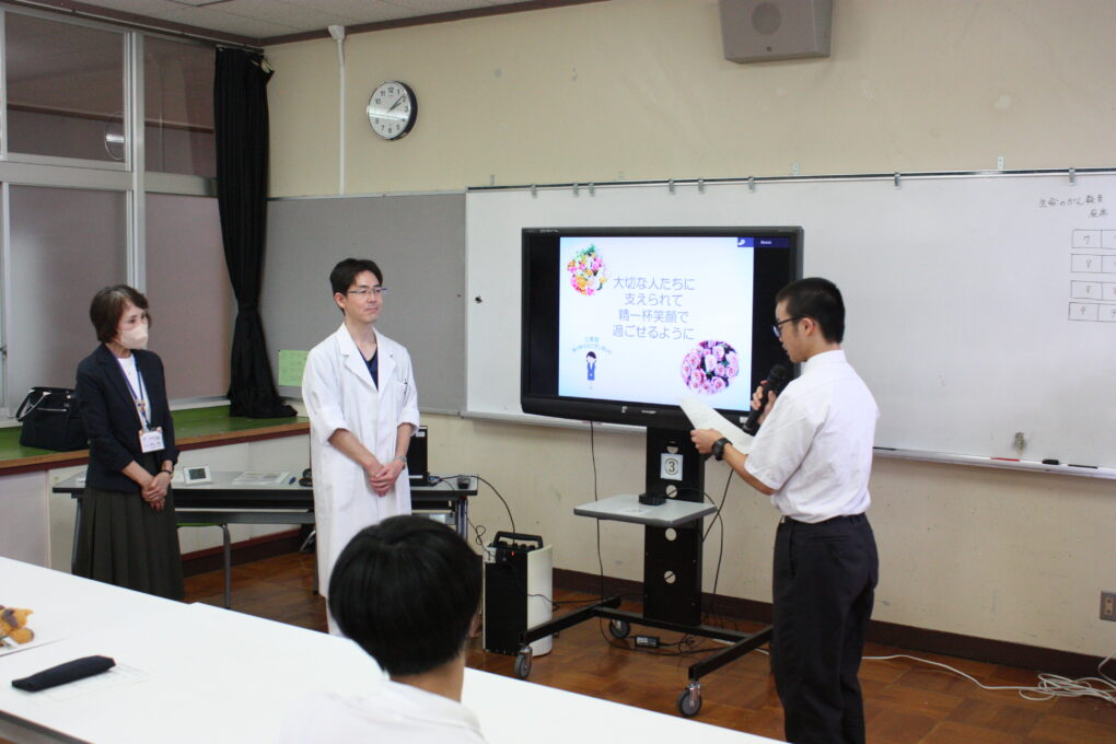 本日、高等部7~9組の生徒を対象に、京都府健康福祉部健康対策課主催の生命のがん教育推進プロジェクトを活用し、生命のがん教育を実施しました。市立福知山市民病院血液内科医長の西山医師、京都府がん教育推進メッセンジャーの砂本様を講師にお招きして、講義を行いました。がんについて学ぶとともに日々の生活を見直し、自分の命について学ぶ機会とすることを目的に実施し、参加した生徒達は寝不足や偏った食生活等、不健康な生活をしていたと振り返り、今回の学びをきっかけに自身の生活を見直したいとまとめシートに記載する生徒もいました。砂本様からは、実体験を通した生きることの喜びについてお話をいただき、自分の命の尊さについても改めて学ぶことができました。講義を受けた生徒が、「身近な人にがんの人がいたらどのように言葉を掛けるとよいですか。」と質問をし、「腫物に触るように接するのではなく、いつも通り笑顔で接してほしいと思います。」と御回答いただきました。今回の講義を胸に、健康に生きるための日々の生活を改め自分の命を大切にしてほしいと思います。西山様、砂本様、本日は生徒達のために貴重なご講義ありがとうございました。