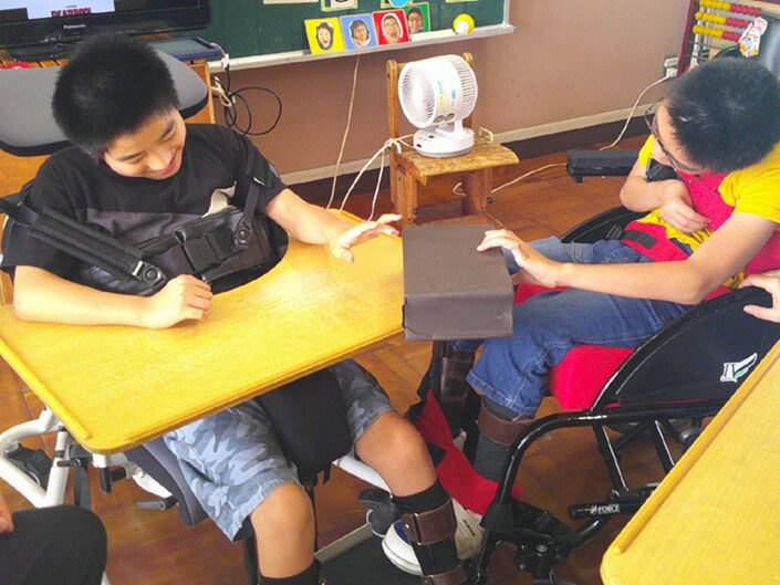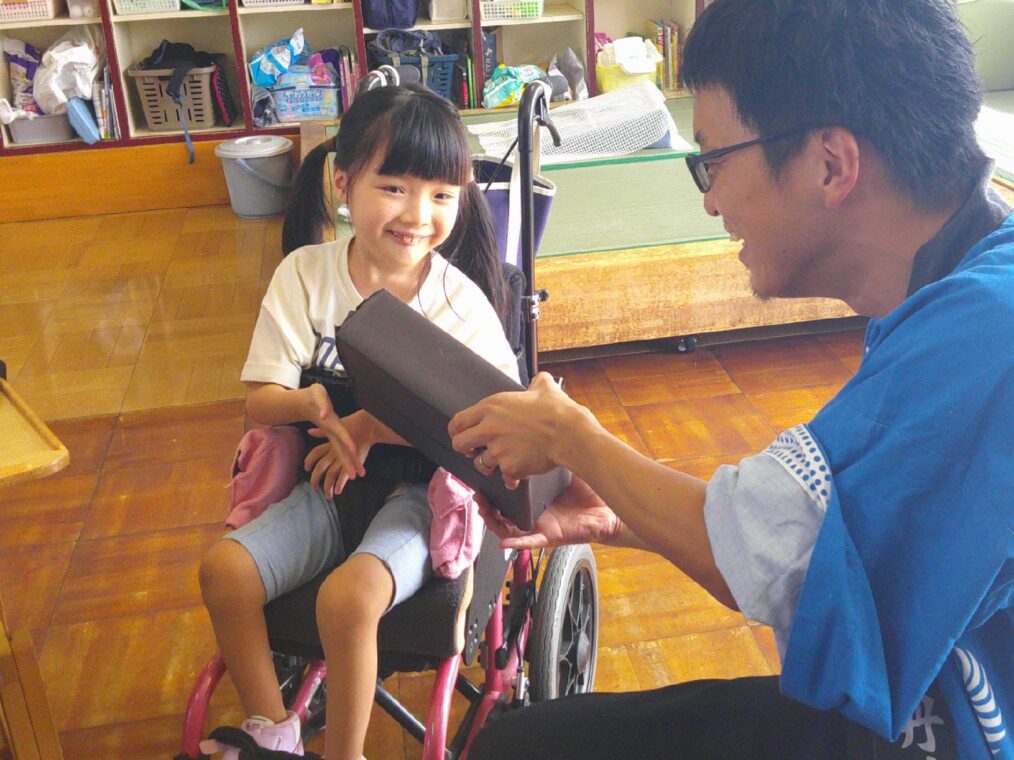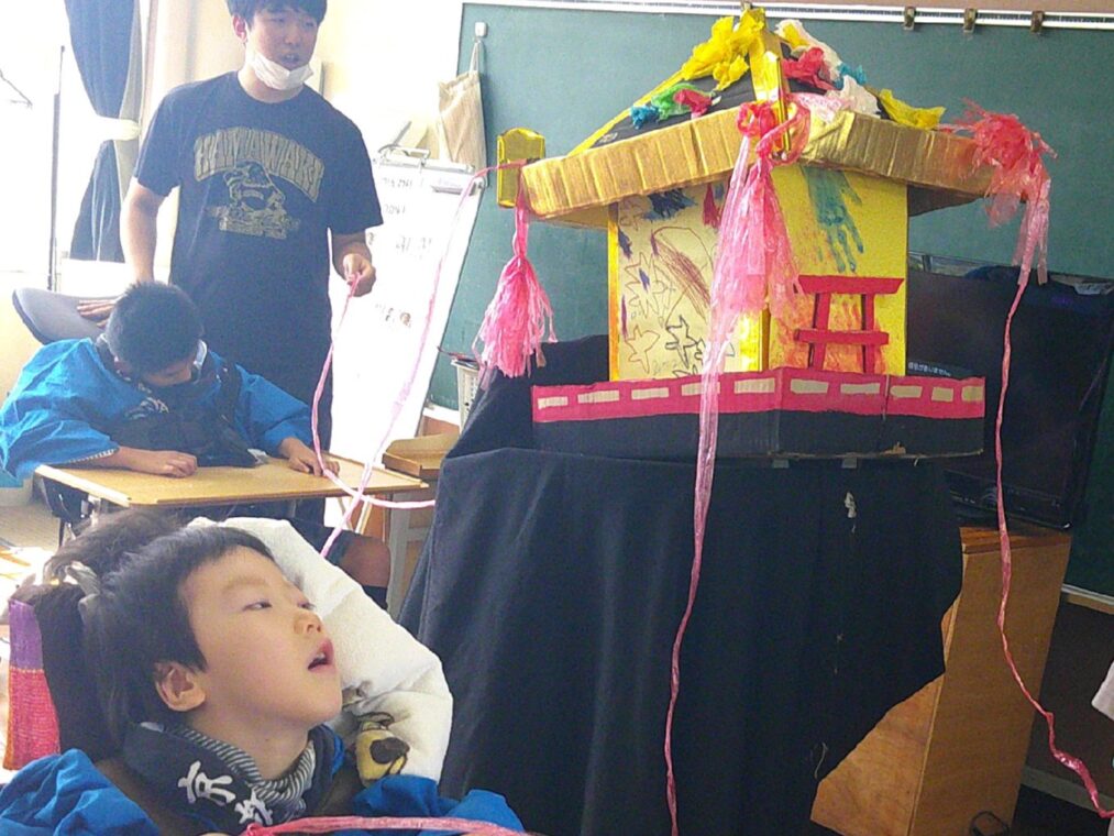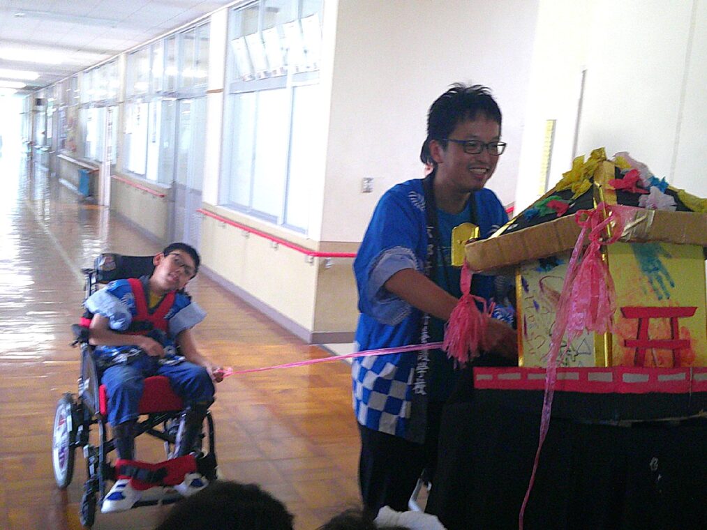 小学部1組「お祭りランドに行こう」に、”おみこしボーイ”が登場!「爆弾ゲーム」では、迫りくる爆弾と音楽にみんなで大笑いしながら遊びました。また、おみこしをみんなで担ぎ、校内を1周。掛け声を新たに考えたり、みこしについた紐を懸命に引っ張ったりして、楽しく遊ぶことができました。
