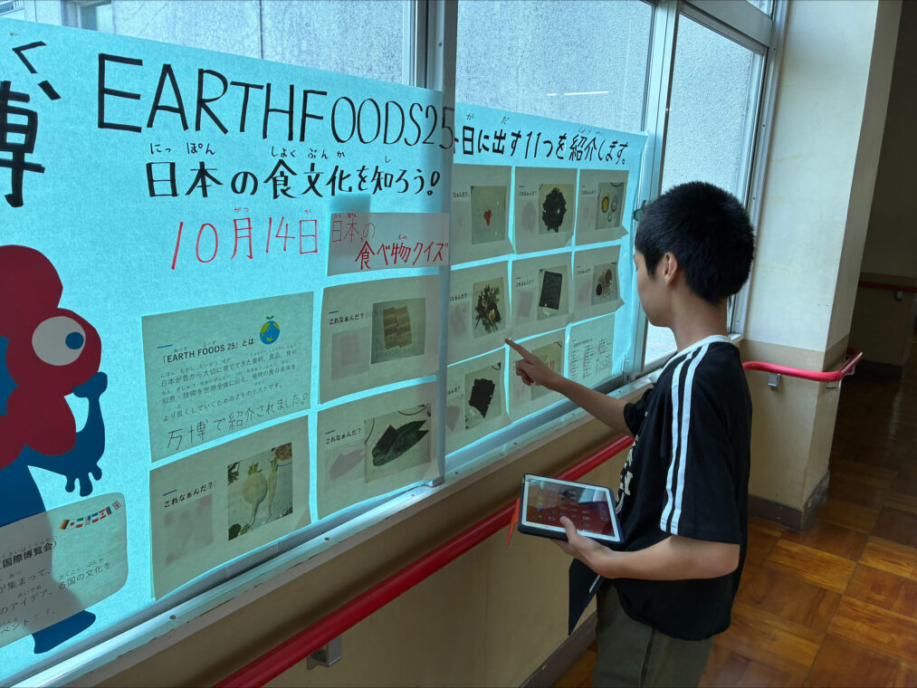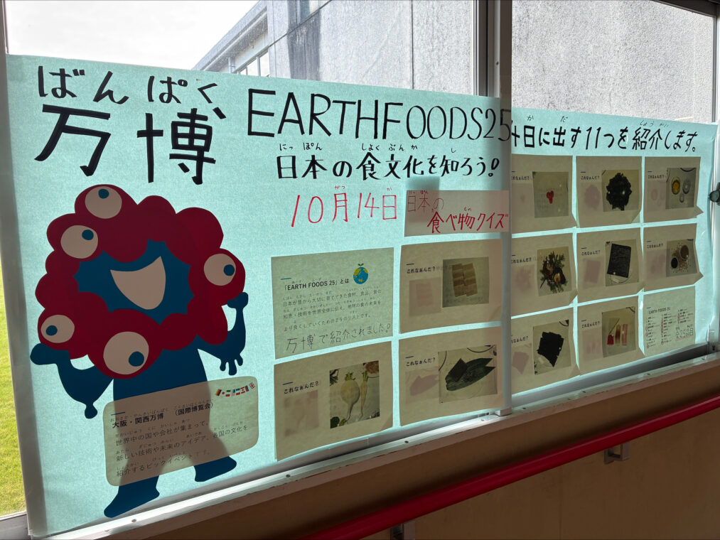 「EARTH FOOD25」は、現在開催中の大阪・関西万博の中で発表された日本発の食材・食品・食文化・技術のリストです。食の未来をより良くするために世界と共有したい25の食の知恵として選定されています。本校でも、EARTH FOOD25の中から11品目を使用した献立を14日に提供する予定にしています。食堂前では、使用する食材に関するクイズを掲示し、児童生徒達も関心をもって見ています。