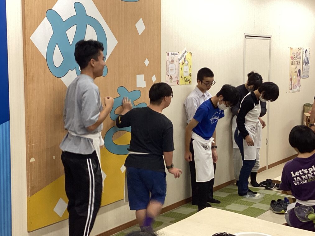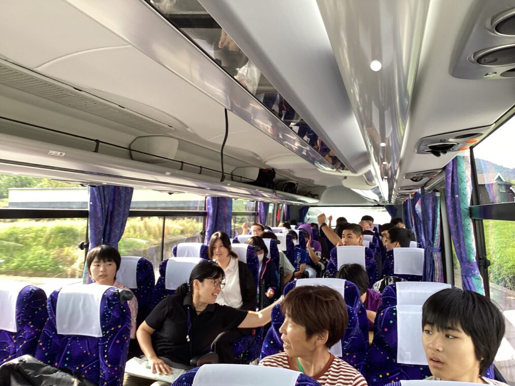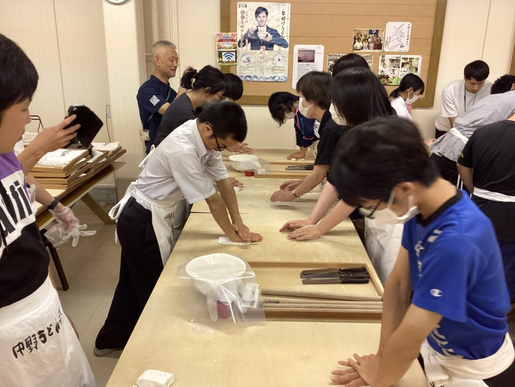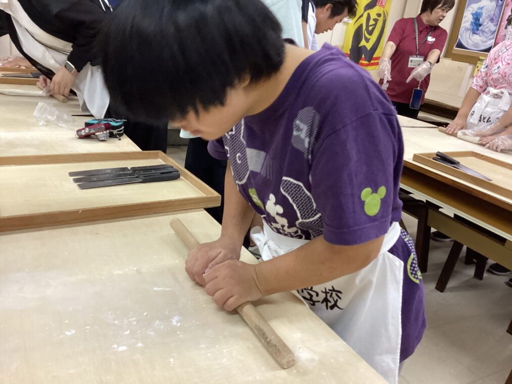 ホテルから移動する車内ですが今日も8組の生徒が考えてくれた、「リクエスト曲のコーナー」でスタートしました。一曲目は「ウルトラソウル」朝からアゲアゲの車内です。香川県の道路を走っていると本当にたくさんのうどん屋さんを目にします。そんなうどん屋さんを通り過ぎ、中野うどん学校到着後、本場讃岐うどんの手打ち体験を行いました。笑いあり・掛け声ありの説明を受けながら、熱心にうどんを打つ生徒たちでした。この後、みんなが楽しみにしているレオマワールドに向かいます。