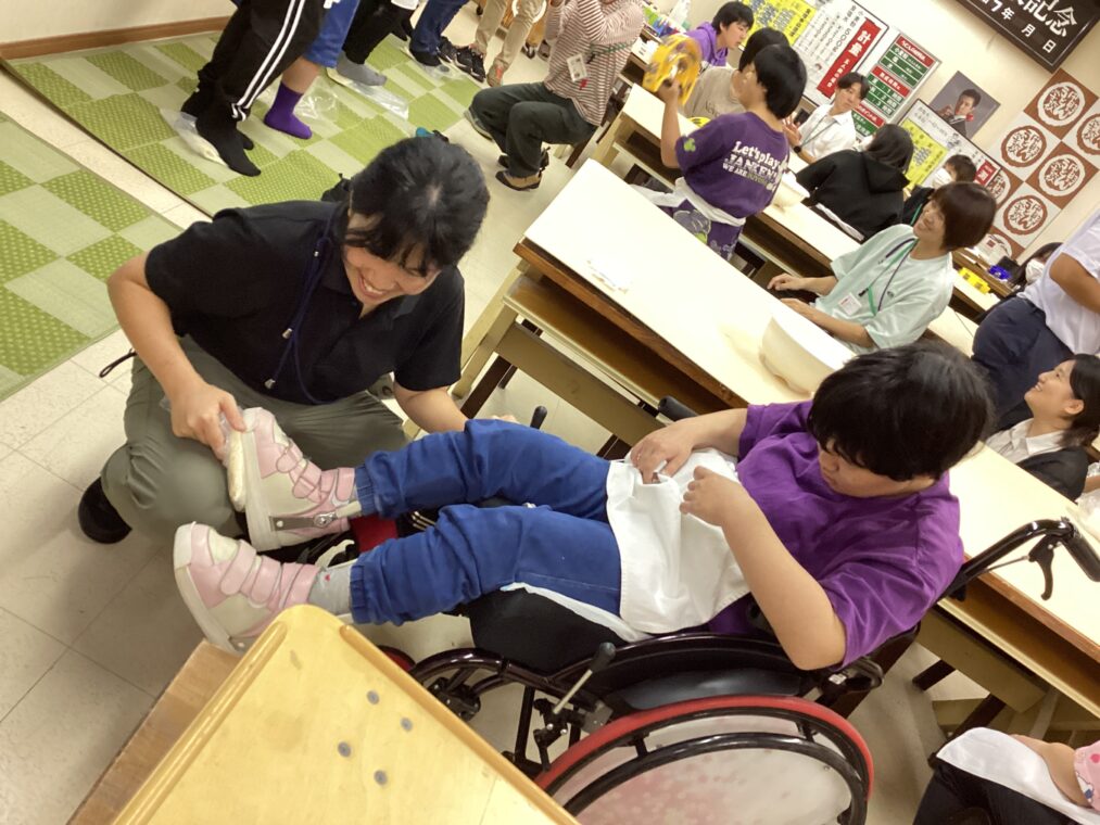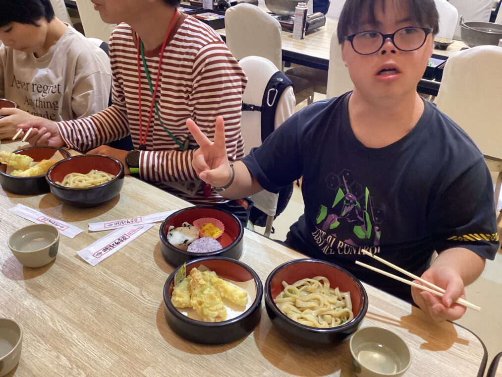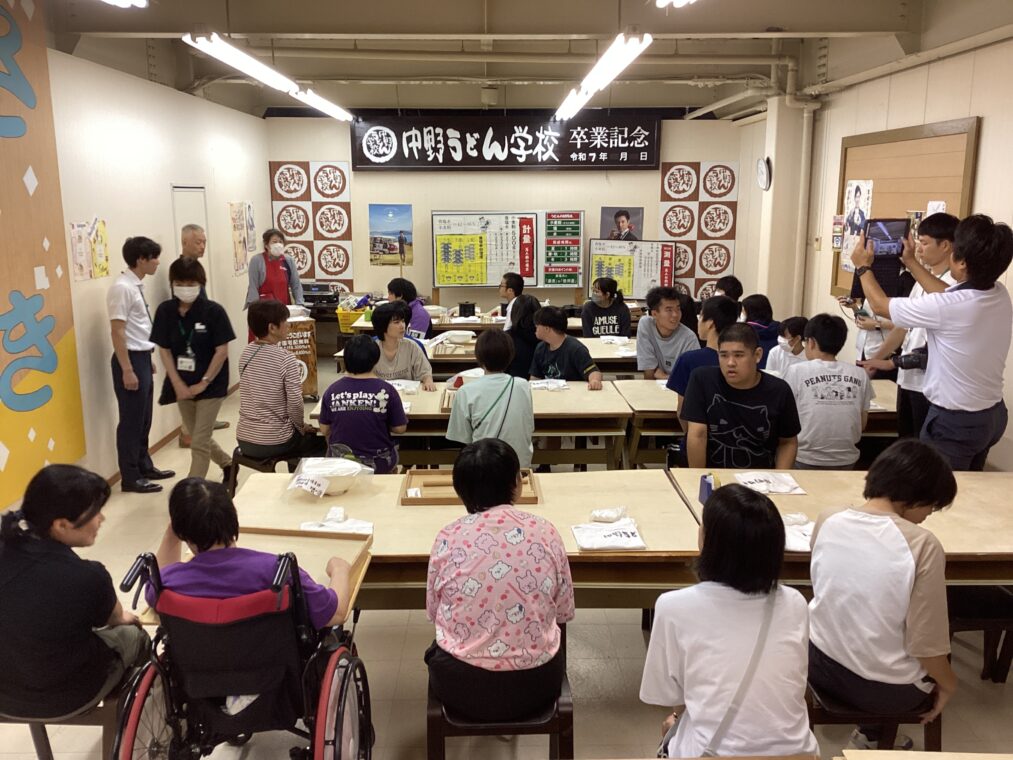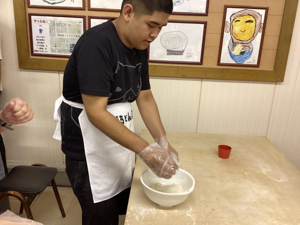 ホテルから移動する車内ですが今日も8組の生徒が考えてくれた、「リクエスト曲のコーナー」でスタートしました。一曲目は「ウルトラソウル」朝からアゲアゲの車内です。香川県の道路を走っていると本当にたくさんのうどん屋さんを目にします。そんなうどん屋さんを通り過ぎ、中野うどん学校到着後、本場讃岐うどんの手打ち体験を行いました。笑いあり・掛け声ありの説明を受けながら、熱心にうどんを打つ生徒たちでした。この後、みんなが楽しみにしているレオマワールドに向かいます。