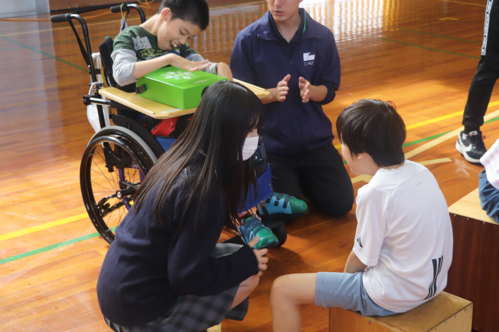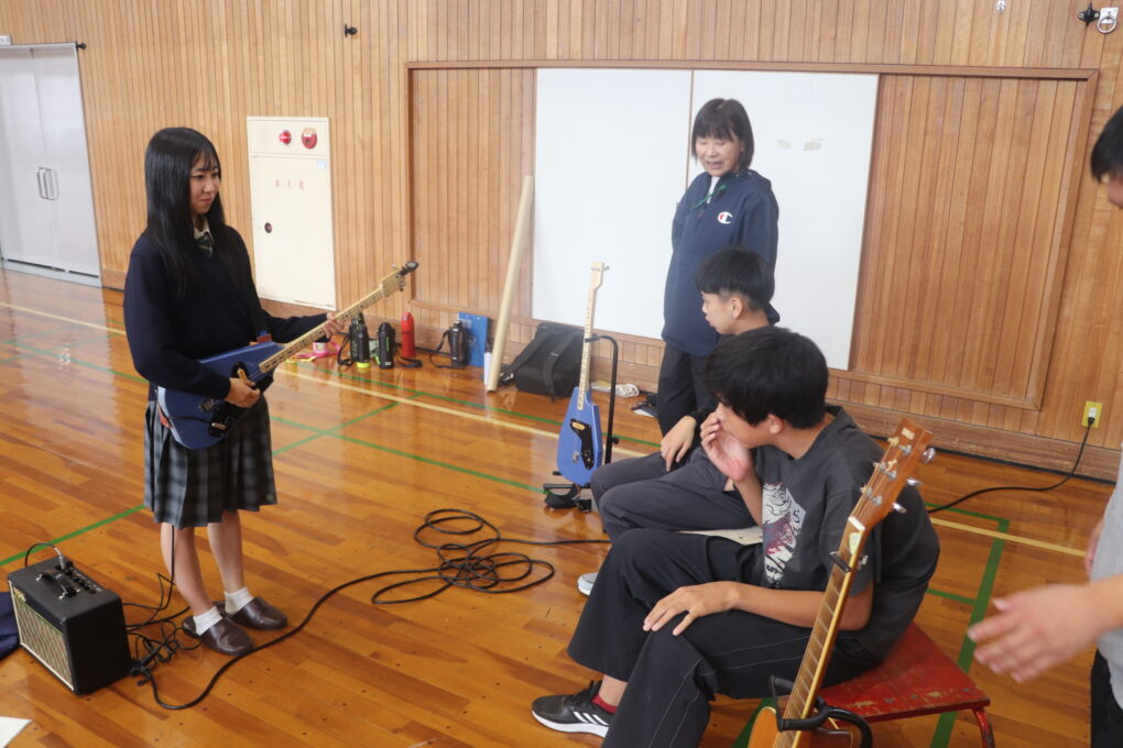 また、その後は軽音楽部の皆さんに、中学部3~5組の生徒が学習発表会の音楽発表で使用する楽器の演奏方法の指導をしてもらいました。声の出し方やドラムの叩き方、弦楽器の音の出し方等、わかりやすく教えていただき、生徒達は大変嬉しそうにしていたのが印象的でした!教わったことを元に、今後も引き続き練習を頑張りましょう!