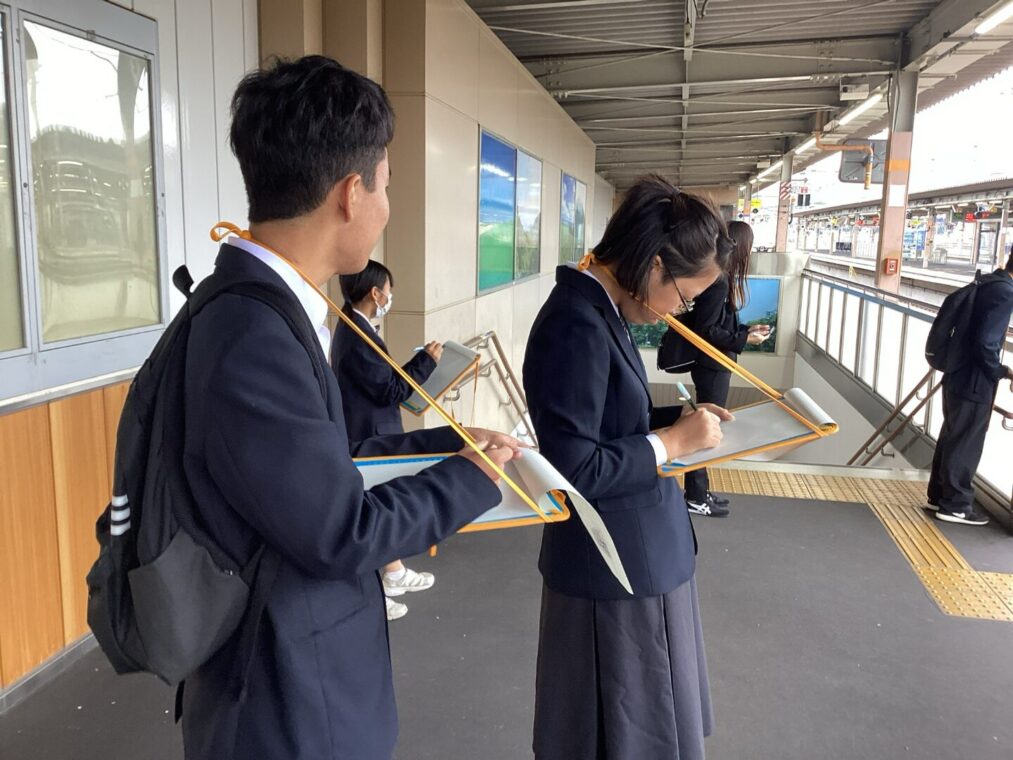 22日(水)、28日(火)の二日間、高等部5、6組の生徒が地域の会社や販売店、作業所等で働く方々へのインタビューを通して、適切な対応方法を学ぶため、校外学習に出掛けました。22日は、ミツウマスポーツ、福知山駅構内、菓樹工房きぬがわの三つの店舗及び施設を訪問しました。生徒達は3グループに分かれて活動し、施設内で働く方々の様子を見学をしたり販売されている商品について学んだり、インタビューを行ったりしました。地域で働く方の様子を間近で感じることができました。