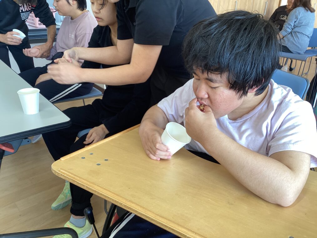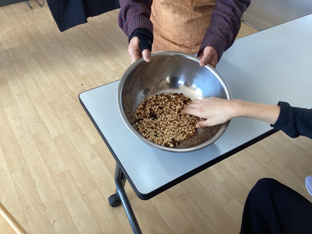 トピックス・News記事高等部1・2組では生活単元学習の授業で「めざせ!スイーツマスター」という単元に取り組んでいます。今日は食いく先生の事業を活用し、亀岡市在住の中野さんと荒木さんに来校していただき、ポン菓子についての説明や紙芝居、調理の実演を見せていただきました。完成するときに鳴る大きな音に少しびっくりした生徒もいましたが、「すごかったなぁ」と感想を話し、その後美味しくいただいていました。中野さん、荒木さん、お忙しい中来校していただきありがとうございました。