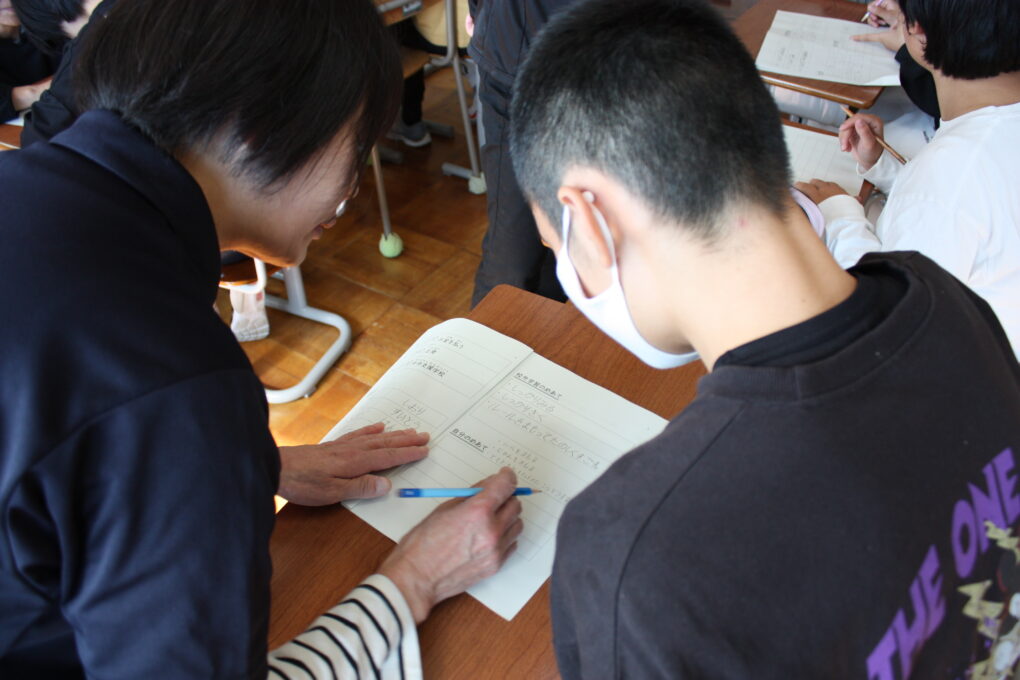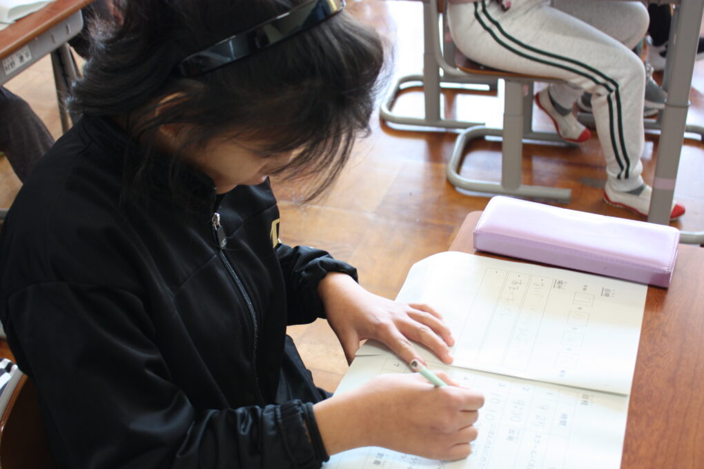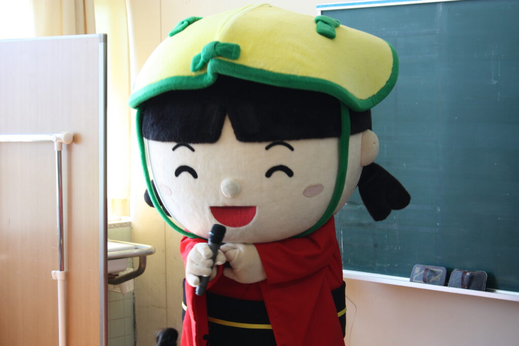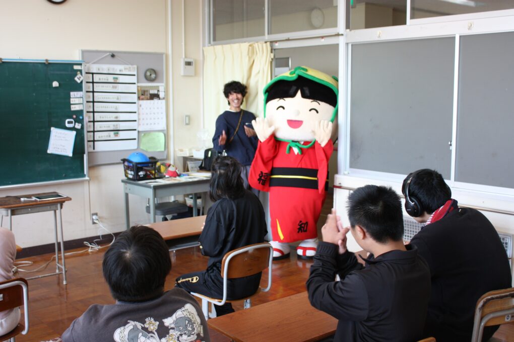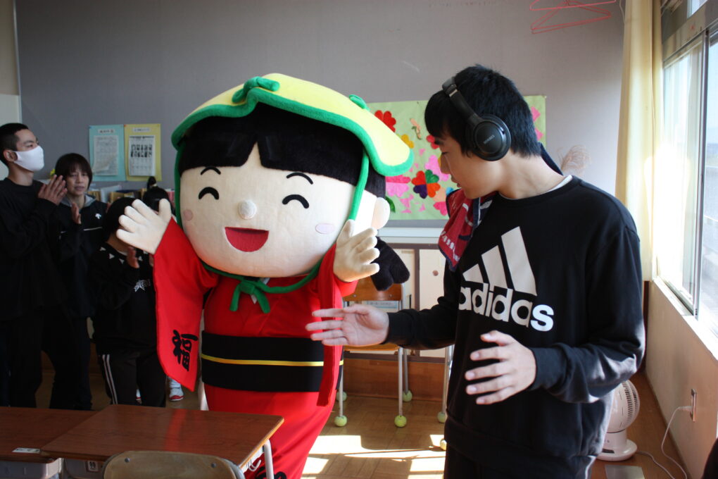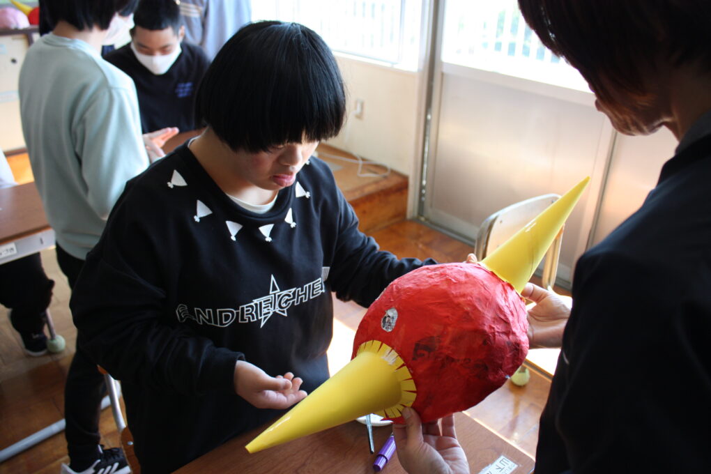 高等部3、4組の生活単元学習では、前期に引き続き「福知山を盛り上げよう」という単元で福知山の施設や歴史等について学んでいます。授業をいつも通り進めていると、教室に福知山のマスコットキャラクターのどっこちゃんが登場!生徒達は、驚きと興奮の様子でどっこちゃんのもとへ駆け寄っていました。ふれあった後にどっこちゃんは一旦退席し、来週予定されている校外学習に向けた事前学習や福知山の鬼にちなんだお面の作成をしました。お面の製作を終えると、再びどっこちゃんが教室に戻ってきてくれて、最後は、一緒に楽しくダンスをしました。今後、同グループは福知山市内の施設や福祉事業所等へ校外学習に出掛ける予定です。これからも福知山について知識を深められるよう学習していきましょう!