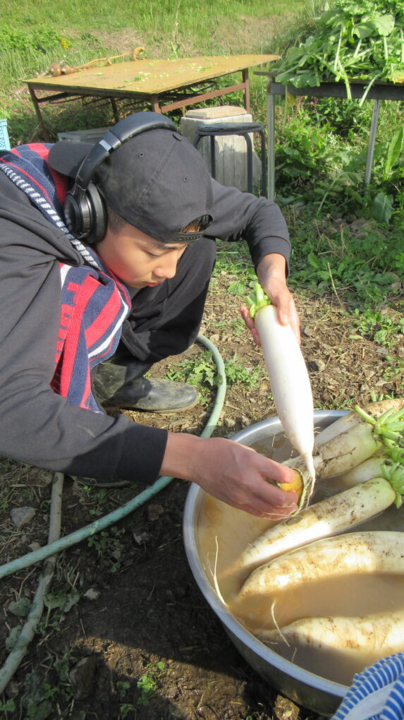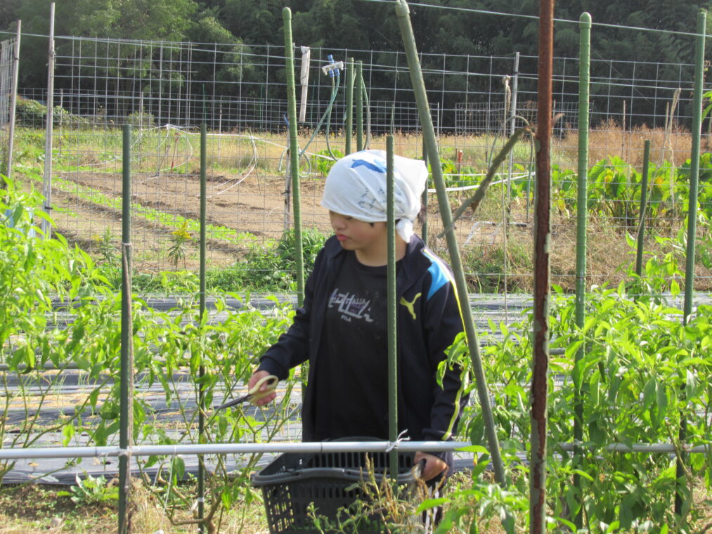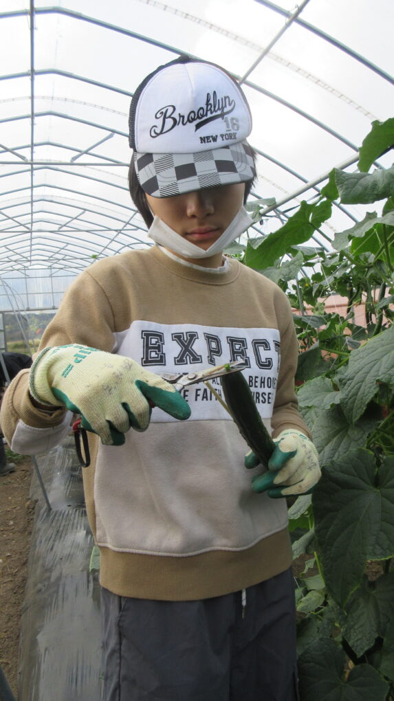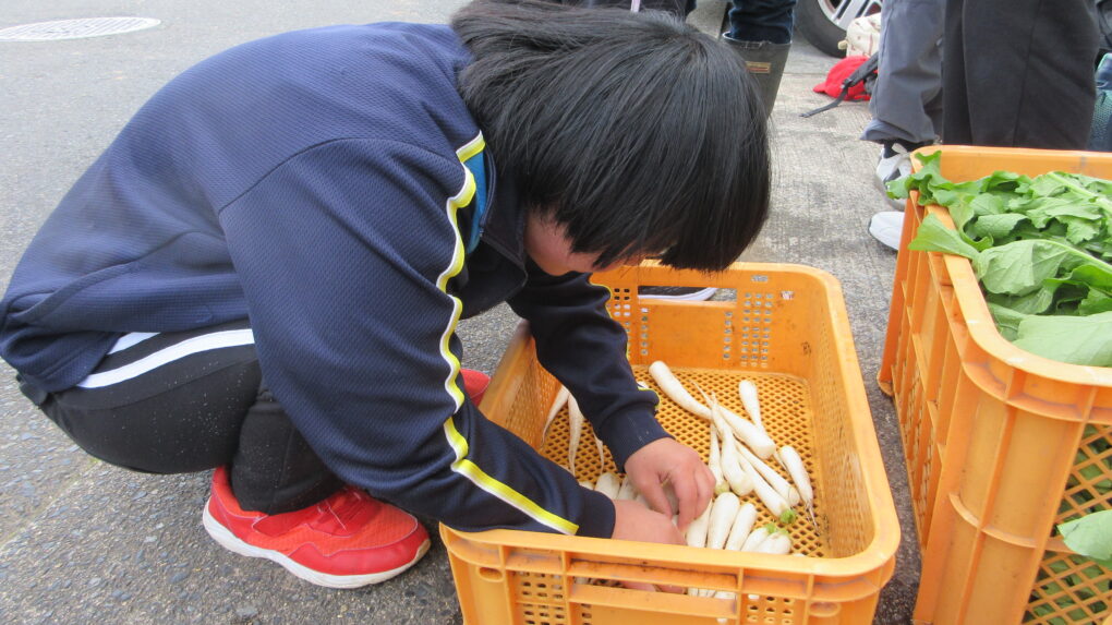 7日、高等部3、4組の生徒達が農業の魅力ややりがいについて理解を深めることを目的に校外学習に行きました。今回は、農園作業を行っている福祉事業所の友就館様と福知山市内で農園を営むおちゃのこ菜菜様で農業体験をさせていただきました。午前中に訪れた「おちゃのこ菜菜」では、広大な農地で育つきゅうりの収穫とこれから収穫の時期を迎える大根の間引き作業をしました。生徒達は普段も行っている農業の作業に黙々と手を進めていました。一仕事した後は、持参したお弁当で昼食をとり、午後からの農作業へ。友就館様へ場所を移して、午後からは、3グループに分かれてネギの収穫と出荷に向けての梱包作業、ピーマンの収穫等を体験しました。一日を通しての農作業に生徒達は疲れた様子もありながらも、今後の進路や授業につなげるため最後まで作業に励んでいました。お世話になりました、おちゃのこ菜菜様、友就館様、貴重な体験をさせていただきありがとうございました。