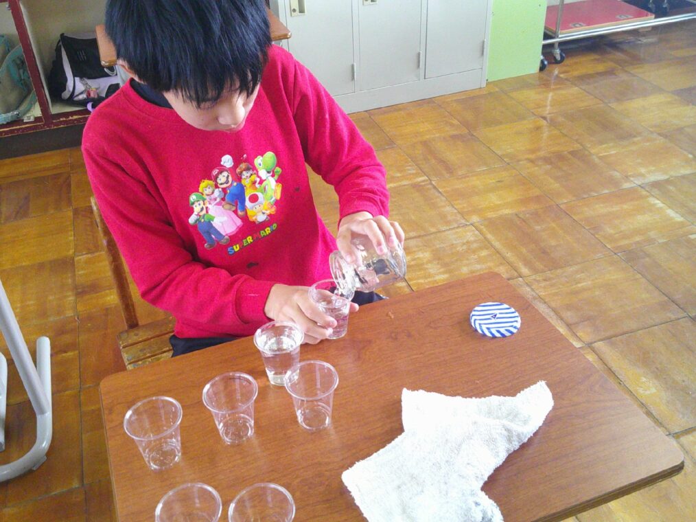 トピックス・News記事小学部は高学年がグループに分かれて算数を行いました。「水のかさ」について学習したグループは、容器に入っている水のかさを量って比べたり、dLの単位を使って表したりしていました。また、「数と計算」について学習したグループは、「○○の人は?」と、いろいろなテーマの人数を数えたり、数を比べたりしていました。机上学習も行いながら、身の回りのものの数や量に関心をもって取り組んでいます。