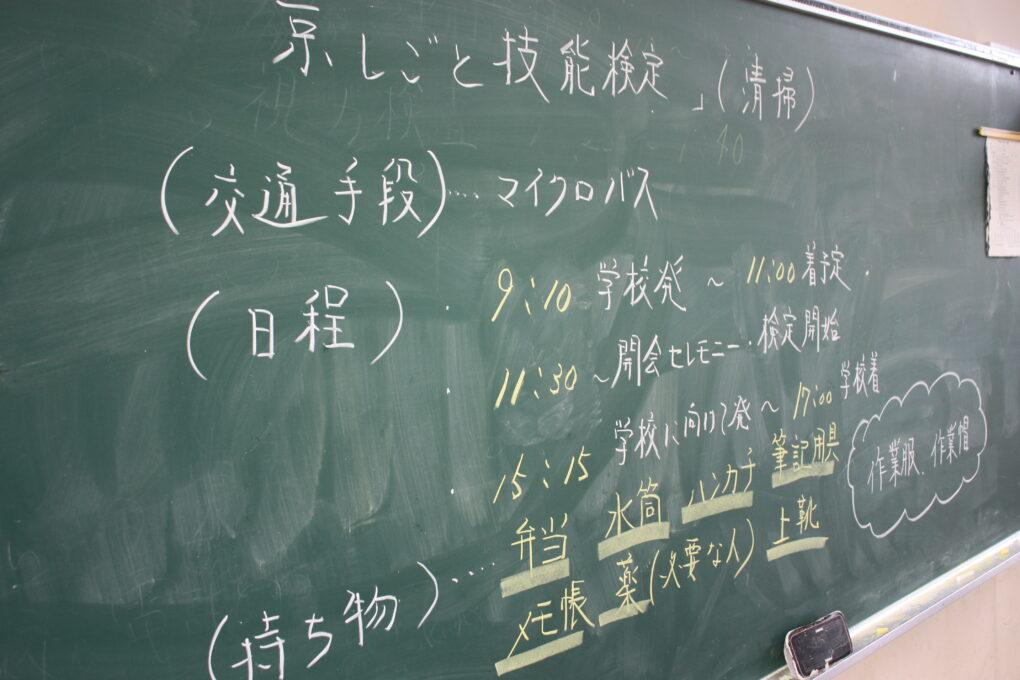 トピックス・News記事明日、京しごと技能検定【清掃】が島津アリーナ京都にて、開催されます。検定に向け11名の生徒が参加し、日々の練習で身に付けた技能を披露します。本日、明日よい成績を残せるようにと最後の確認に加え決起集会を開きました。それぞれが、目標をもって明日に挑むと意気込んでいました。検定の結果等は、明日以降の記事でもお伝えします。参加する生徒のみなさん、自信をもって挑みましょう!!