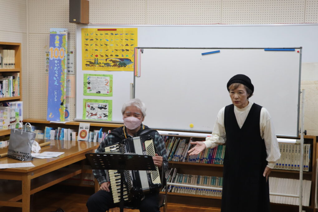 絵本「パンダ銭湯」の読み聞かせが終わった後に、「お風呂に入ってみたい人?」の問いかけの後、大きな声で「はい!」「入ってみたい!」と話す児童も多くおり、その後オリジナルの歌に合わせてみんなで楽しく活動をすることができました。聴くだけでなく、体験的な活動もすることができた楽しいお話会となりました。