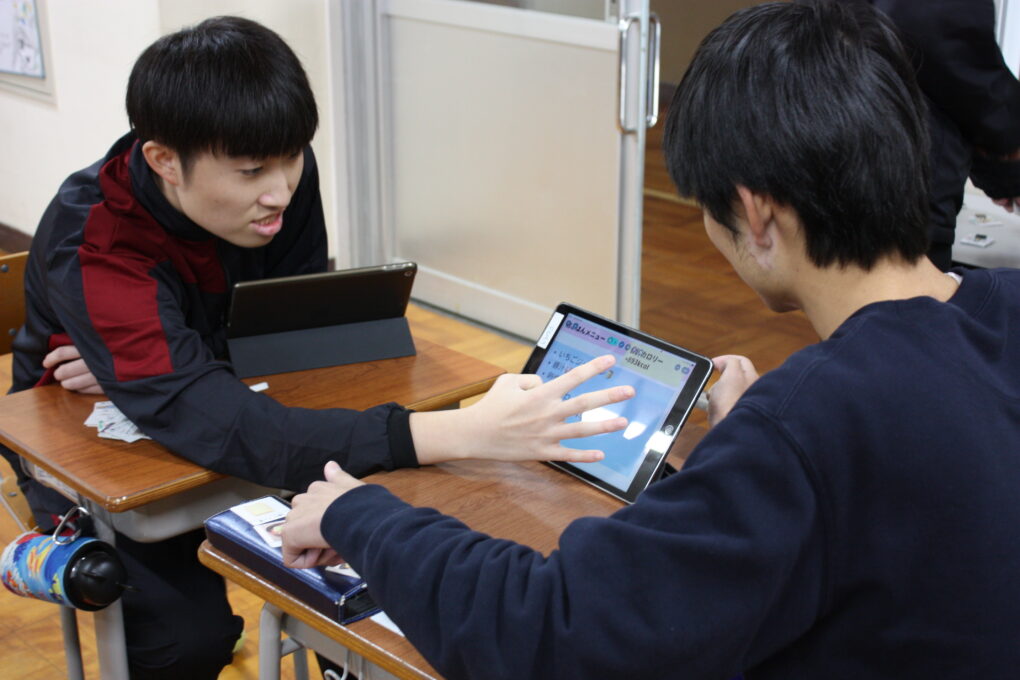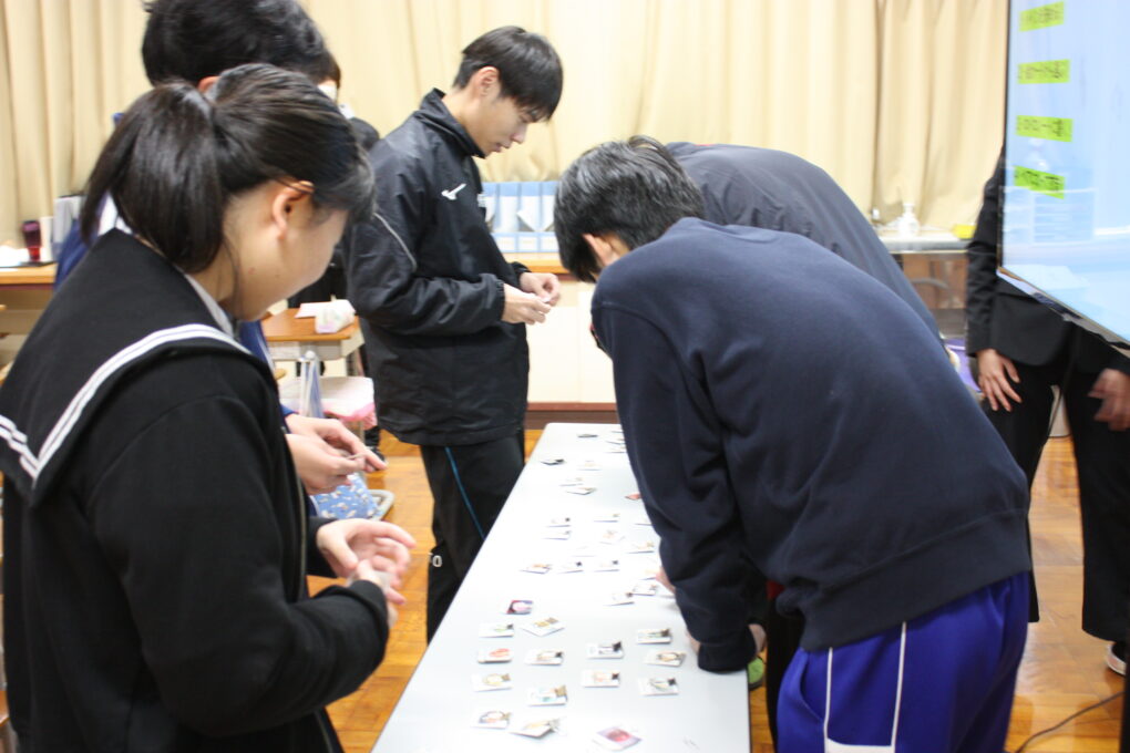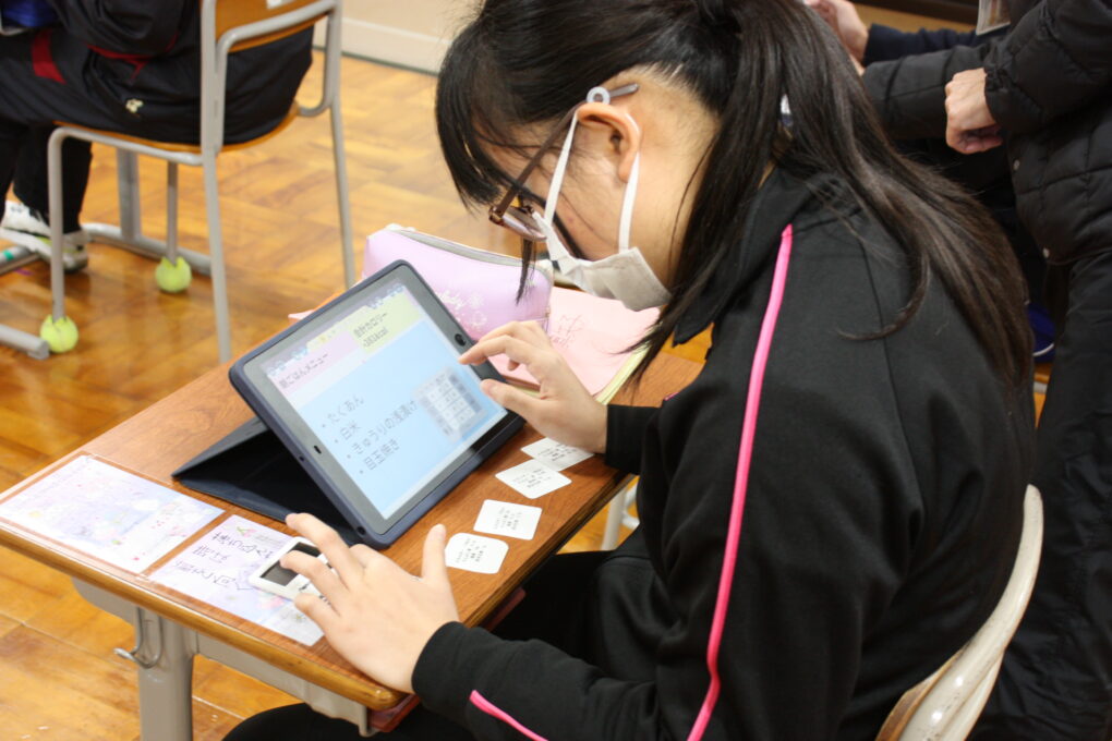 高等部9組の家庭科では、栄養素について学んでいます。今回は、朝食をテーマにして自身の朝食を振り返ったり五大栄養素内の三色(赤:タンパク質、黄:炭水化物、緑:ビタミン)が含まれた理想の朝食を考えたりする学習を行いました。生徒達は、多数並べた食事カードをバイキングのように手にとり、標準カロリー内に抑えることや三色バランス良い献立になっているか等、様々なことを考えながら取り組みました。その後は、お互いの朝食についてペアの友達と意見交流をしました。授業を通して、朝食の必要性やバランスのいい食事について再確認することができました。