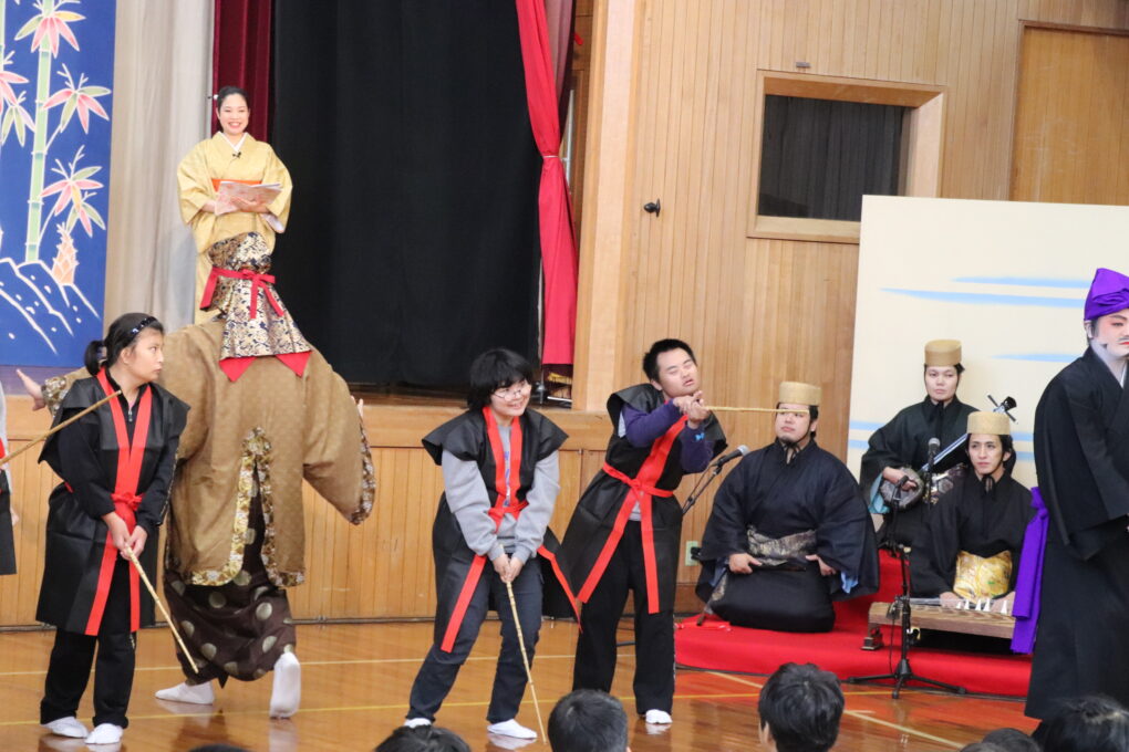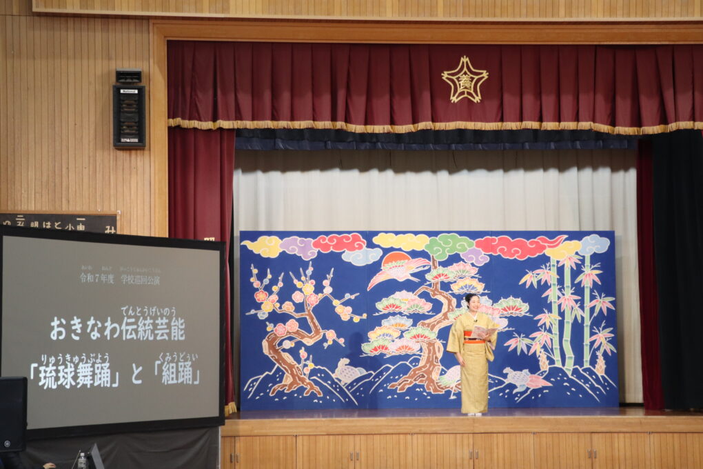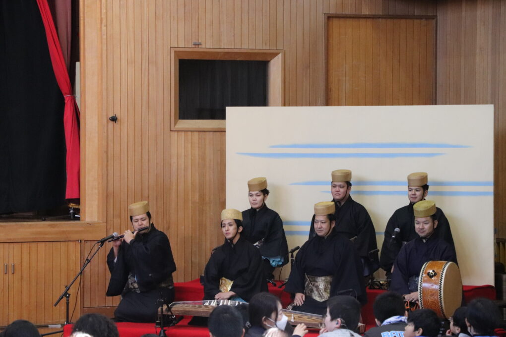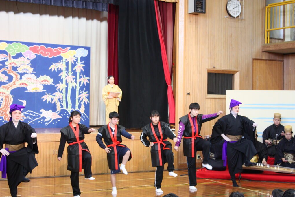 文化庁の学校巡回公演の取組で沖縄伝統組踊「子の会」の皆様にお越しいただき、芸術鑑賞会を実施しました。