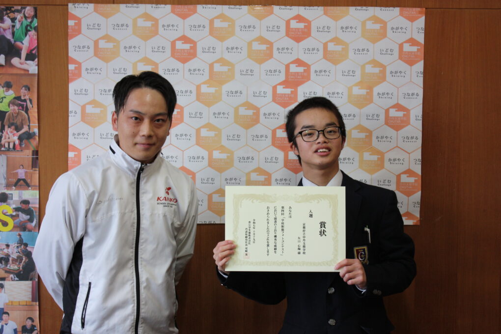 トピックス・News記事学生服メーカーKANKO様が主催する学校制服フォトコンテストに、授業で撮影した写真を応募しました。その中で、高等部生徒が撮影した一枚が、見事「入選」を果たし、京都府内の学校では唯一の受賞となりました。本日、撮影した生徒の受賞報告を兼ねて、KANKO様に御来校いただき、表彰式を行い、表彰状を授与していただきました。今後も、見る人を魅了する写真を撮影できるよう努力していきましょう!