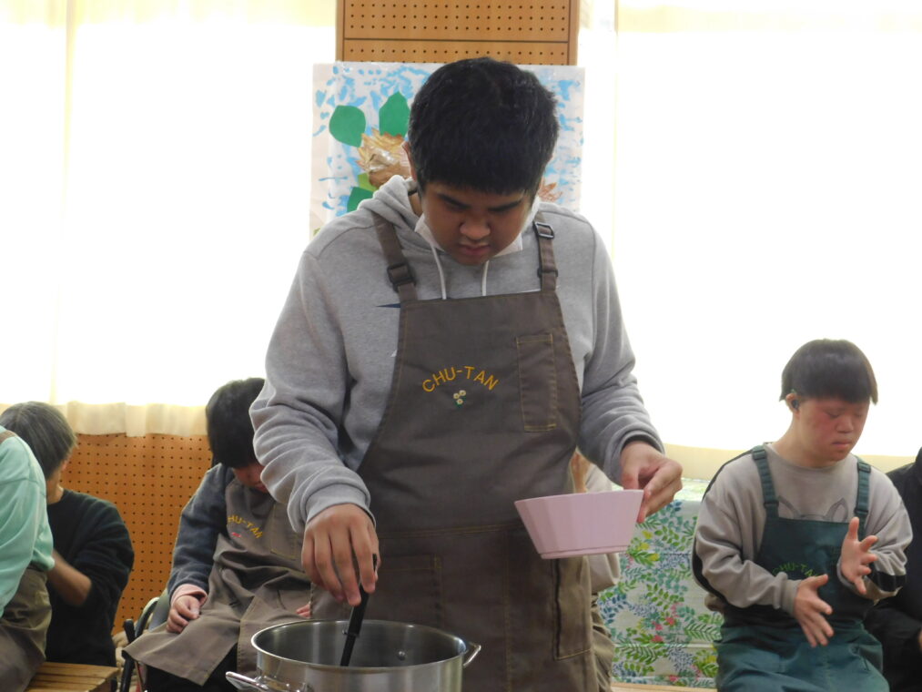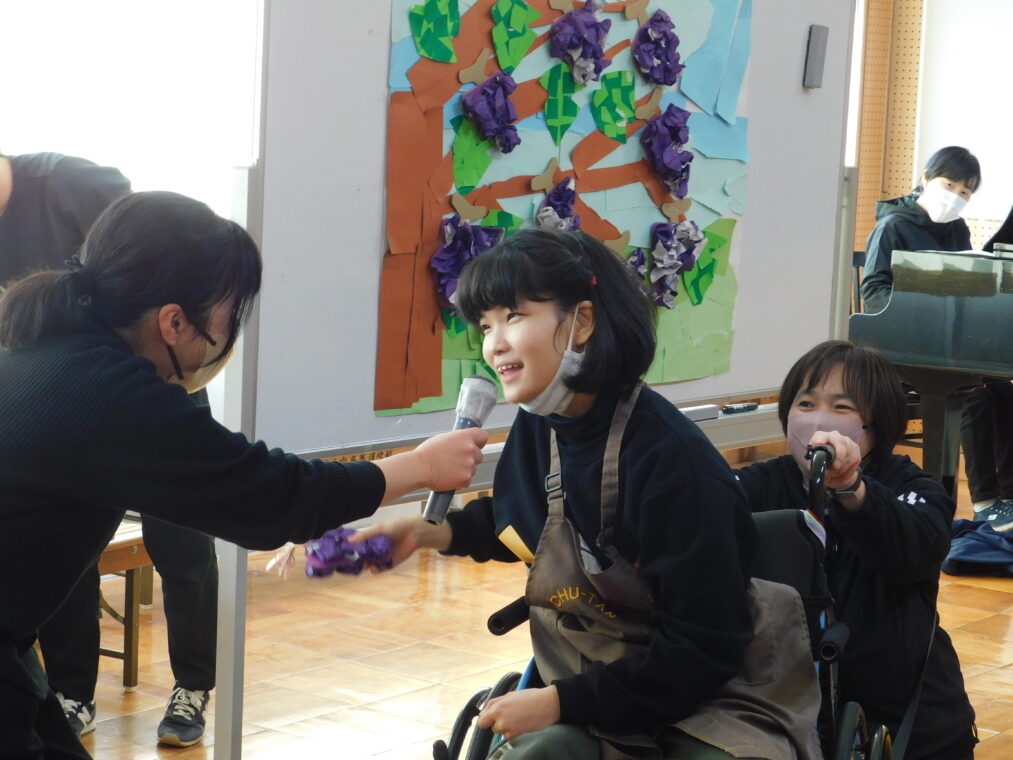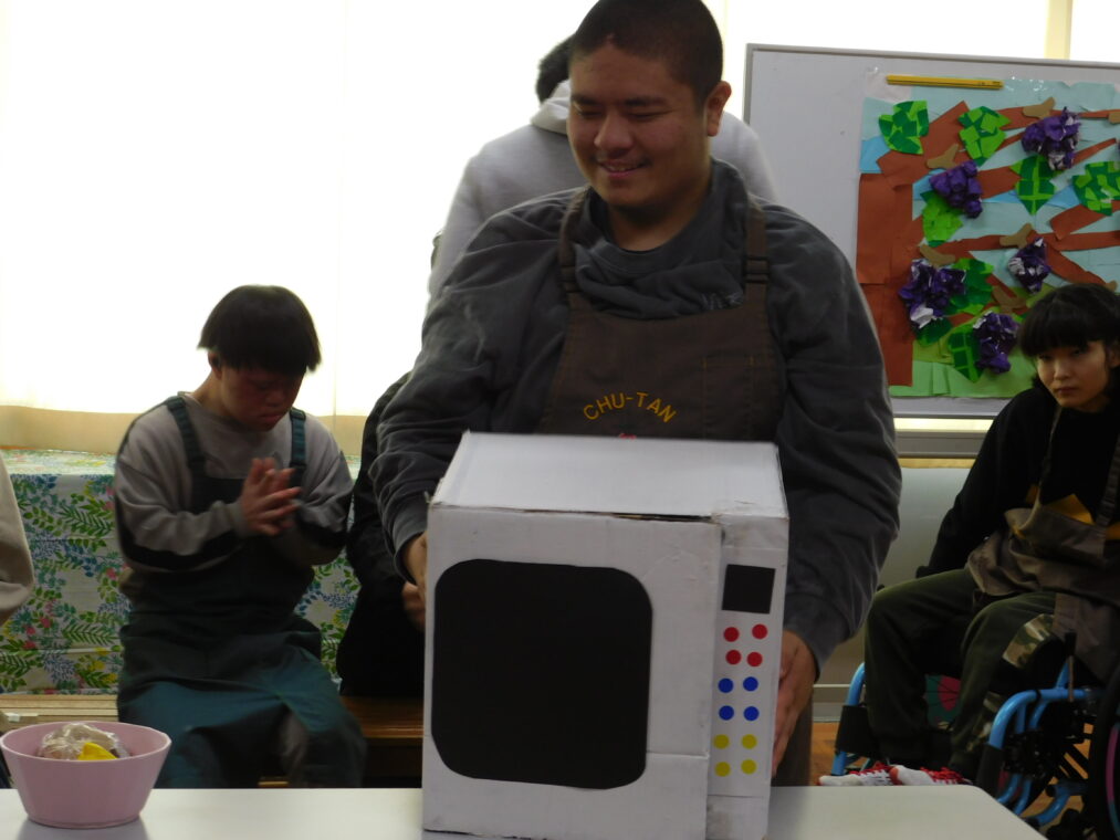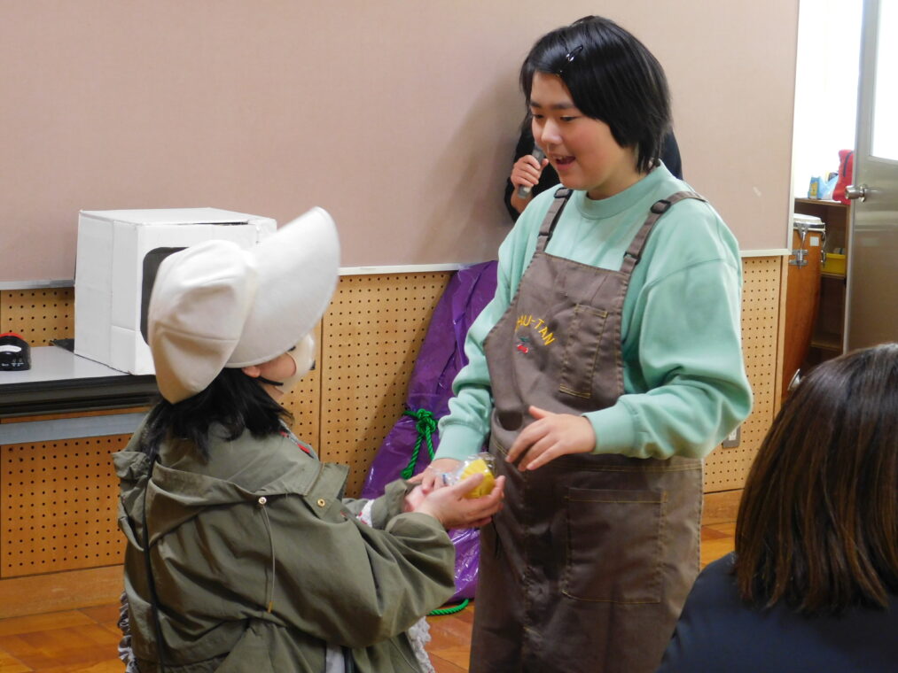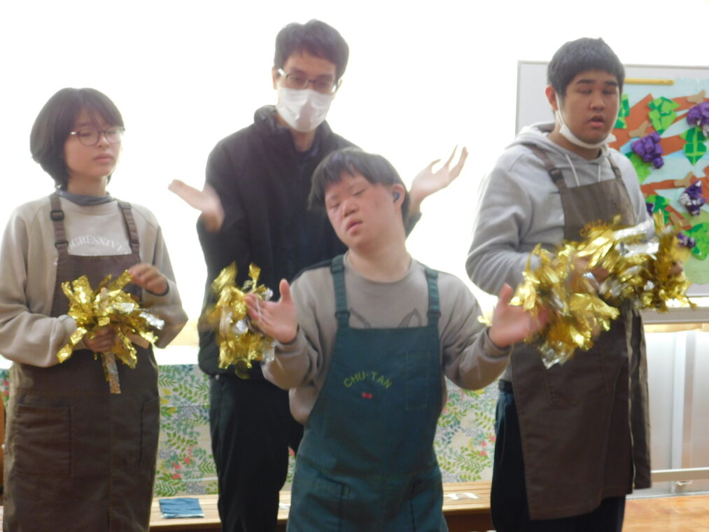 本日から2週間に渡って、学習発表会期間としています。本日は、高等部の1、2組の生徒が2学期の生活単元学習で進めていた単元のまとめを発表しました。「めざせスイーツマスター」という単元で、食べ物をテーマにして生徒が興味関心をもって進め、会当日は単元のまとめとしてお菓子を作る工程を劇にした内容で行いました。高いところにある物をとったりさつまいもを収穫を協力して引っ張たりして、自分たちの役割を果たすことができました。終盤にはポップな踊りを披露し、最後に自作のカップケーキのプレゼントを渡して、和やかの雰囲気で会を締めくくりました。御参観いただいた保護者様、ありがとうございました。