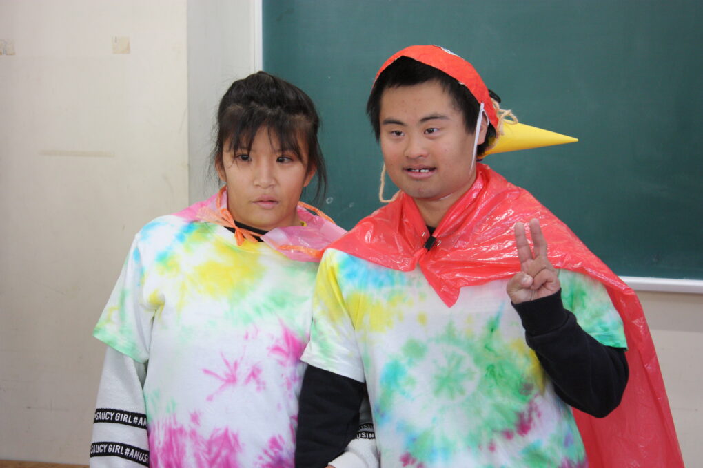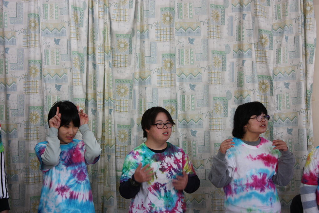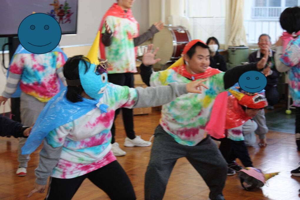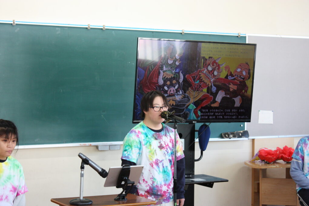本日、高等部3、4組が学習発表会を行いました。同グループは、「福知山をもりあげよう」という単元で学習を進めており、そのまとめとして自作の鬼のお面をかぶったダンス、鬼の物語の朗読、福知山市内の町名が歌詞になった歌の合唱等、福知山市に関連することを大いに盛り込んだ内容で発表しました。生徒たちも、この日のために何度も練習を重ねたことを自信に変え、堂々と自分の役割を果たしていました。終盤の「おー福知山」では、会場の参観者も交えて合唱し、会を締めくくりました。御参観いただきました保護者の皆様、ありがとうございました。