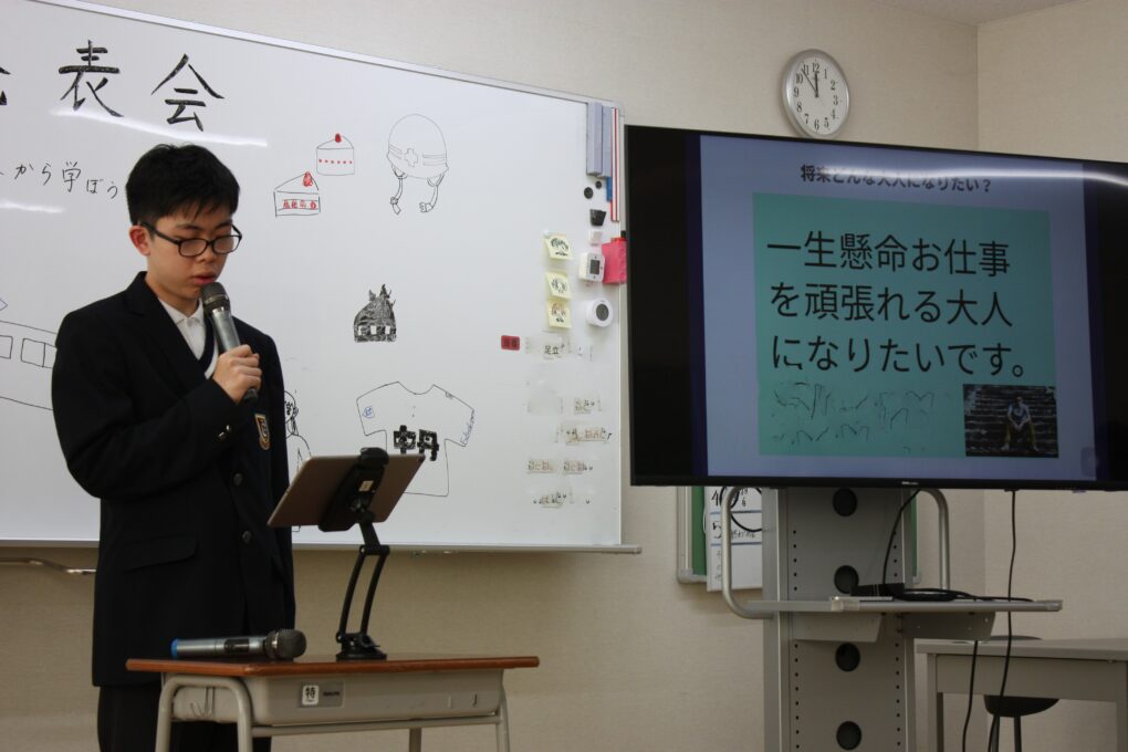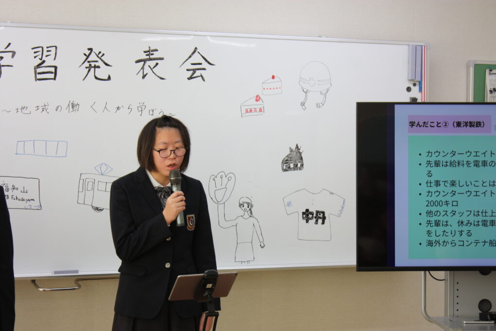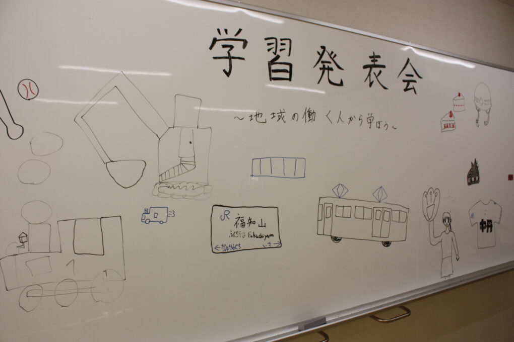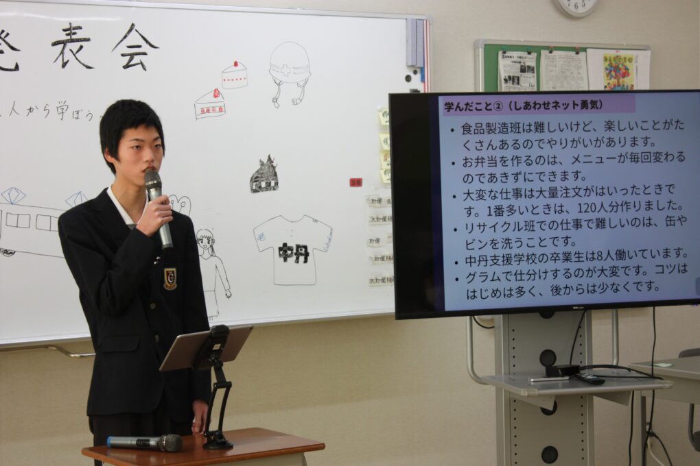本日、高等部5、6組が学習発表会を行いました。同グループは、10月に福知山市内の企業や事業所に出向いてインタビューを実施し、その内容をまとめたものをグループ毎に発表しました。進路に向けて、実習真っ只中の生徒も多く”働く”ことに焦点を当て、なりたい大人になるために学習や生活でどのようなことを心掛けていくかを考え発表シートを作成しました。生徒たちは、学んだことを伝えようと力強い言葉で発表を行うことができました。地域で働く人(先輩)から得たことを意識して日々の生活に生かしていきましょう!御参観いただきました保護者の皆様、ありがとうございました。
