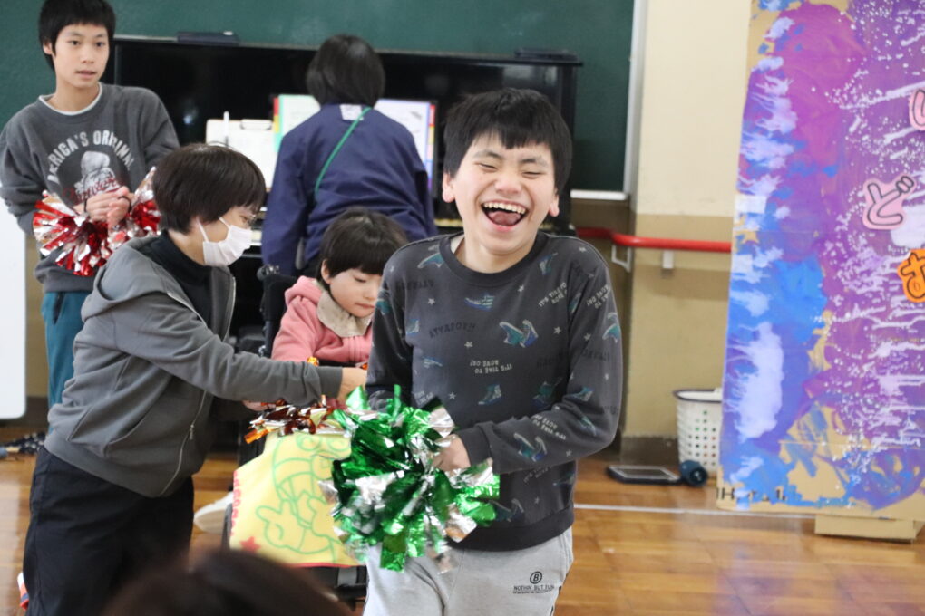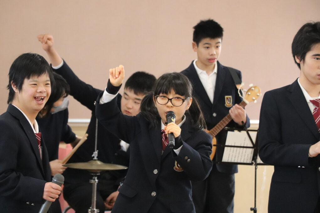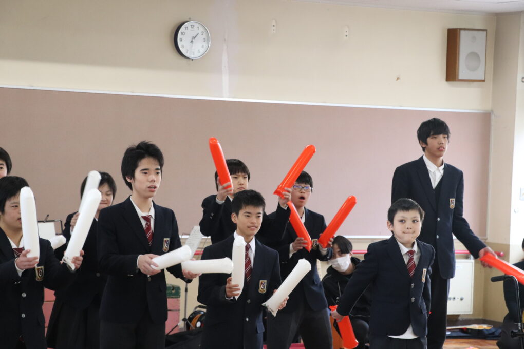 中学部1、2組は学習発表会で音楽発表を行いました。会場のホールには旗や看板などこれまでの授業で製作したものを飾り会場を華やかに装飾していました。