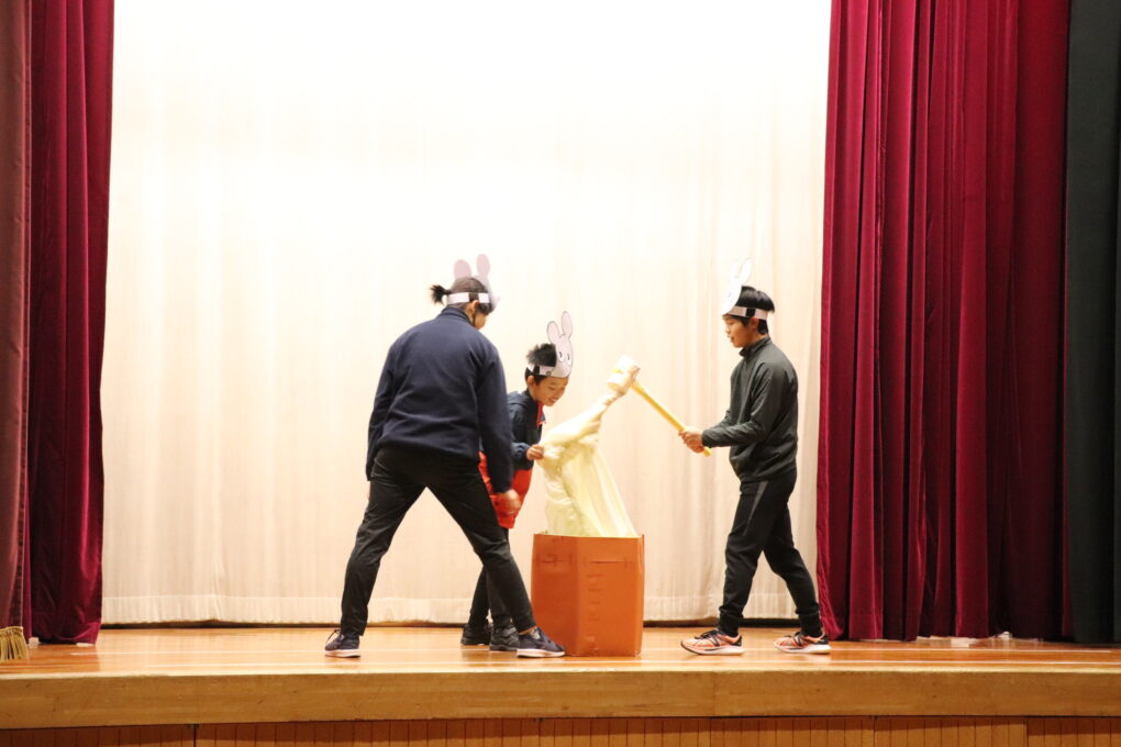 6、7組は「十二支のお節料理」という題で劇を行いました。これまでの学習でお節について、具材や由来等調べ、学びを深め、発表会当日に学んだことを劇にして発表を行いました。