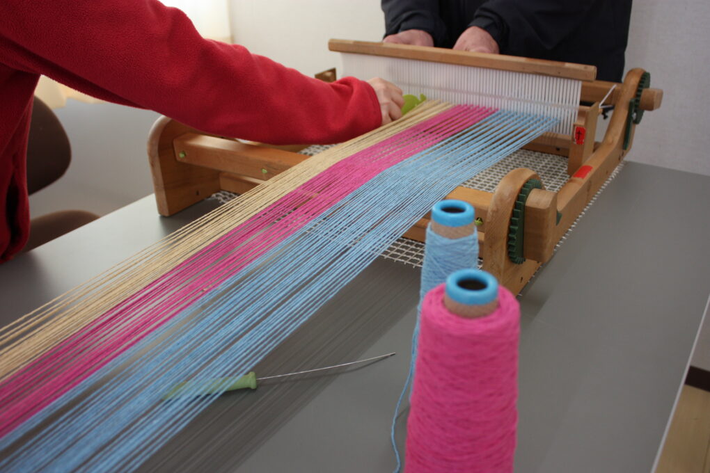 高等部5、6組では、さをり織りの作業を行っています。先日の校内販売会では、さをり織りの新製品をたくさん購入していただきありがとうございました。完売したということで、今後のモチベーションにつながっています。生徒たちは、今後の販売会に向け技術を高めようと集中して作業に取り組んでいます。生徒の中には、難易度の高い、織り機に縦糸を通す下準備も行っています。