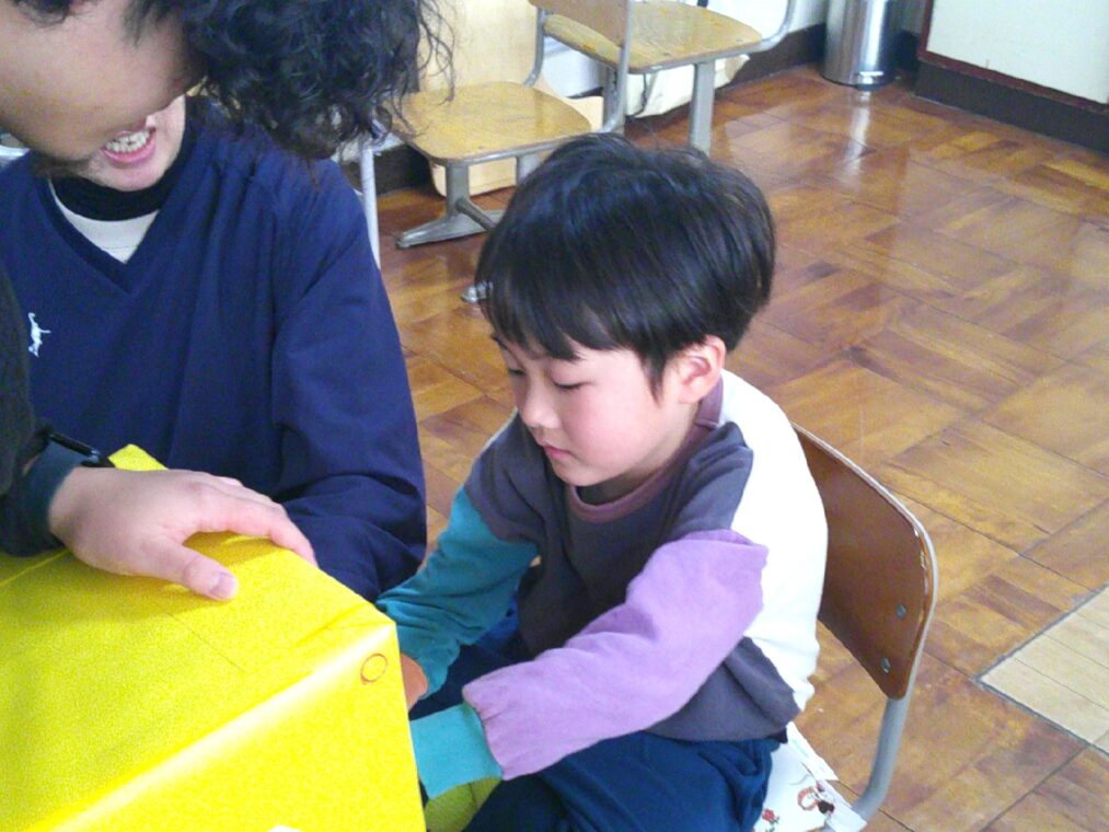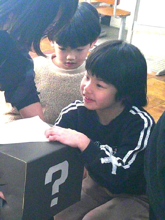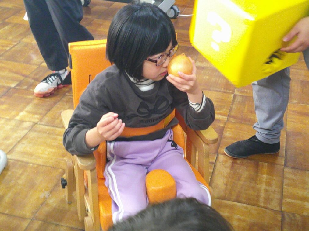 また、小学部6・7組は、「食べ物博士になろう!」と、クイズをしました。はてなボックスに隠された野菜を触って「丸いし、すべすべやからトマト。」「土がついた!」等と、知っていることや新たな発見を伝え合いながら、食べ物について詳しく知ることができました。