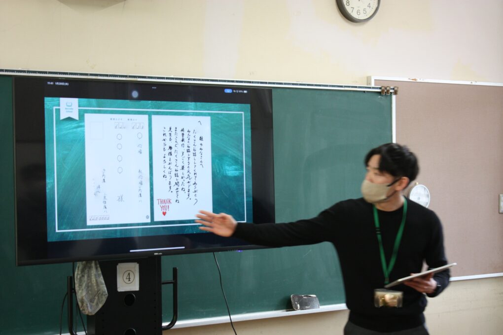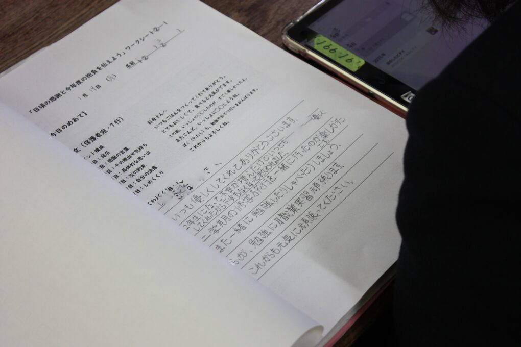 トピックス・News記事高等部8組の国語では、日頃の感謝を伝えることを目的に手紙を書く授業を行いました。親、友達、恩師等、想いを伝えたい方へ日頃の感謝伝わるようワークシートを活用しながら言葉を選択し、手紙を書きました。また、はがきを使用する中で宛名を書く場所や決まり等も同時に学びました。今後も、想いを伝えたり字に込めたりする経験を広げていきましょう。