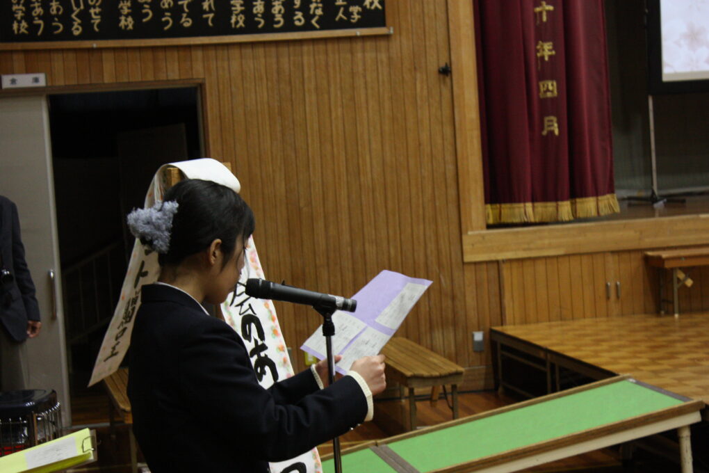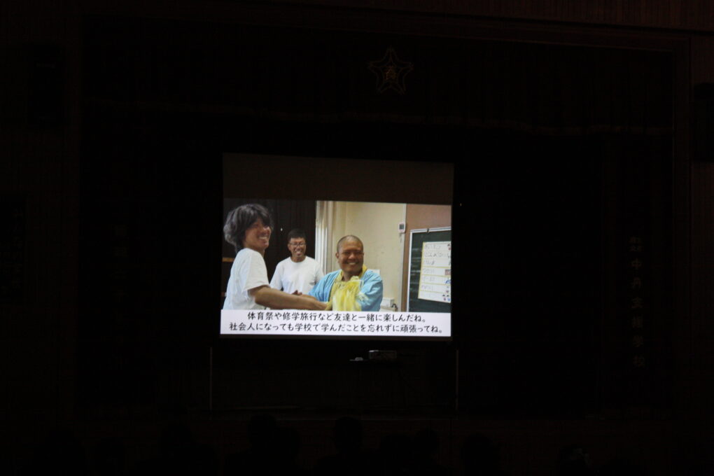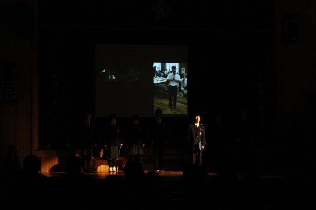 実行委員の入場の合図を受け、18名の3年生が堂々と花道を通り、所定の席に着きました。まずは、高等部7,8組の生徒が作成した3年間の思いを詰め込んだスライドショーを鑑賞しました。1、2年生の発表では、「365日の紙飛行機」を手話付きで届け、「次は自分たちに任せてください。」と言わんばかりの逞しさを感じました。発表が終わり、事前に準備したメッセージが込められた紙飛行機が会場を舞い、3年生からも大きな拍手が送られました。決意発表では、修学旅行のことや実習で感じたこと、友達と過ごした日々等、それぞれの思いが語られました。