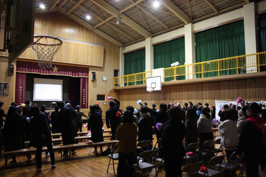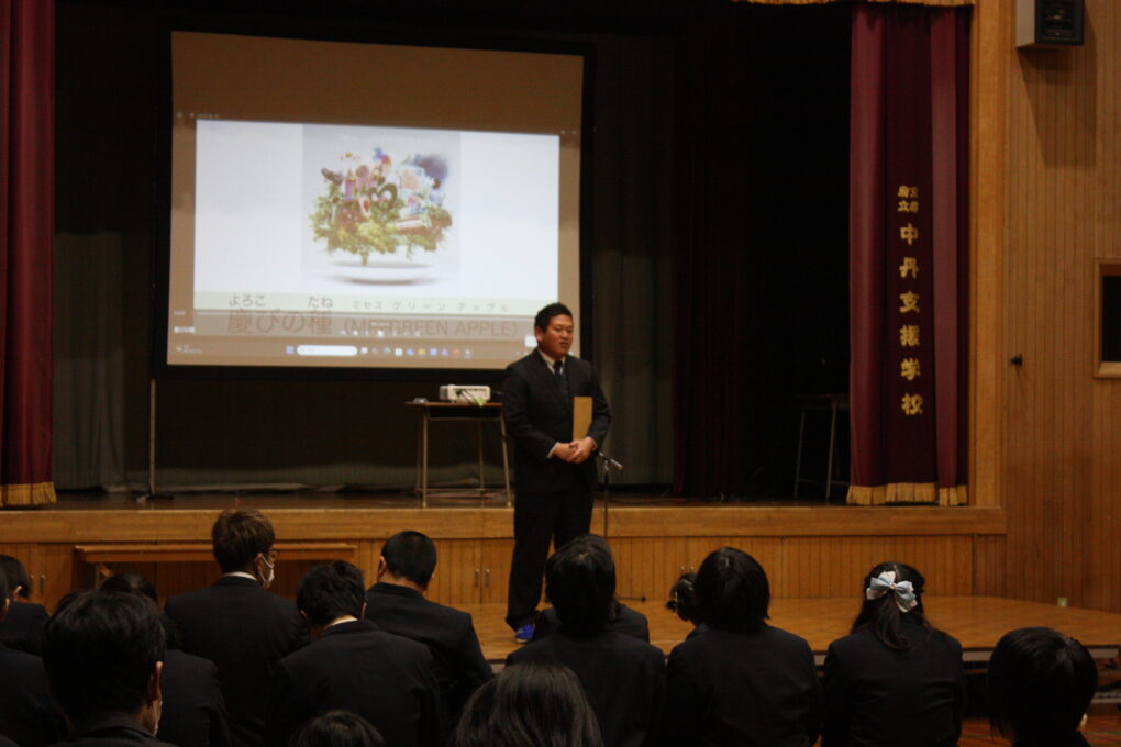会の終盤は、在校生、保護者、高等部職員から、Mrs.GREEN APPLEの「慶びの種」の歌の発表がありました。歌の終盤では、手に持った花を大きく振って合唱し、歌とメッセージを届けました。
