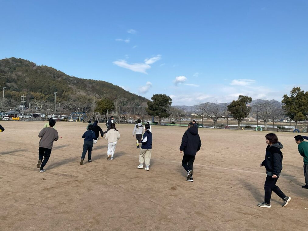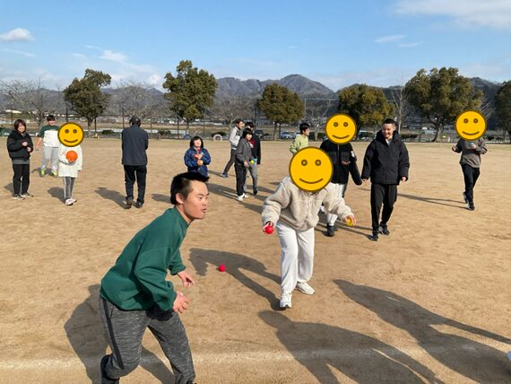 グラウンドに散りばめられたボールを集め、かごに入れるというルールで活動します。指導者がかごを持ち、動き続けます。かごを一生懸命に追いかけ、みんなで分担してボールの回収をします。生徒はどこにかごがあるかやボールがどこに落ちているか近くの友達に伝えながら、すべて回収することを目指します。