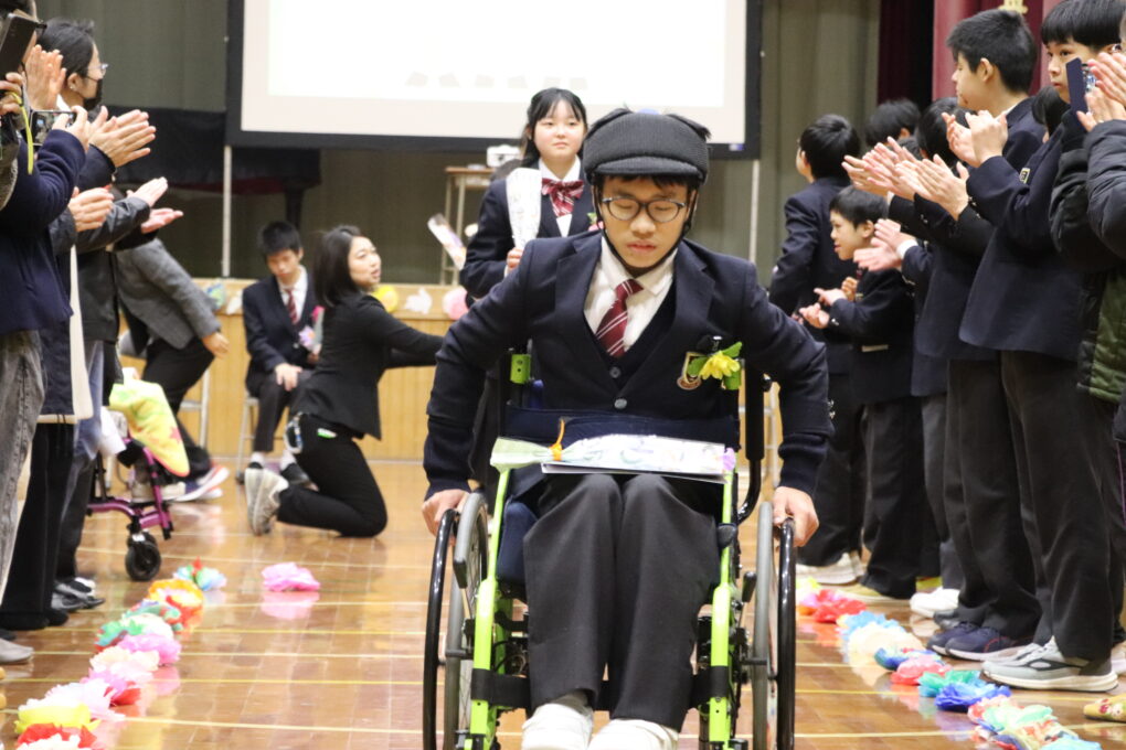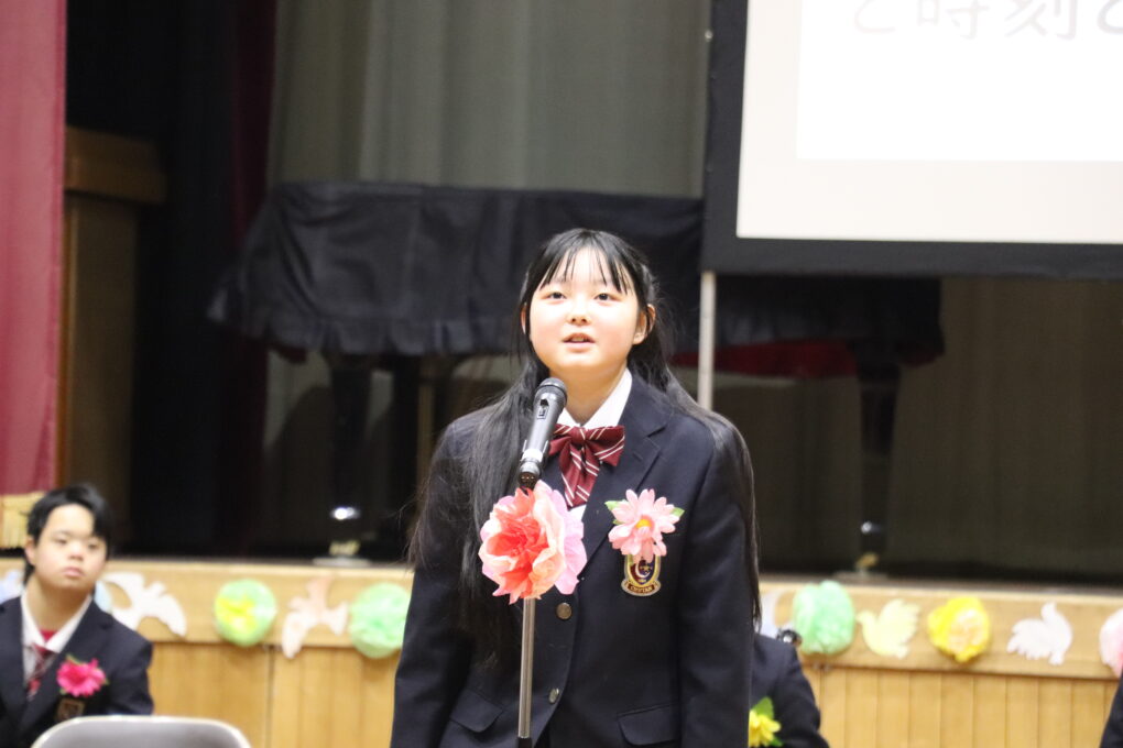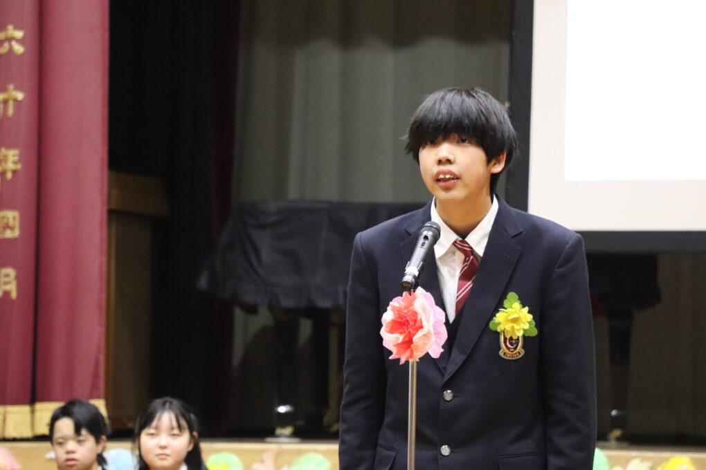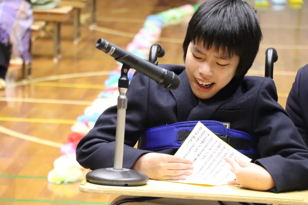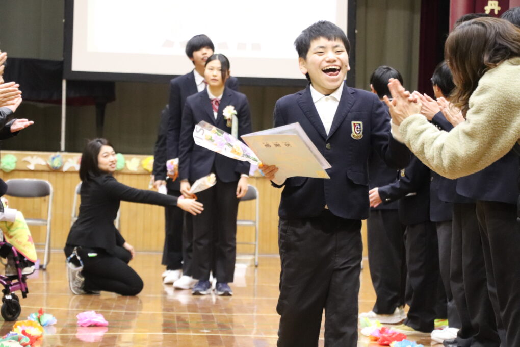 続いて1、2年生の出番です。歌の発表の後、楽しい時間を一緒に過ごした3年生に、2年生の新リーダー長の言葉とともに、心を込めて作成した感謝状を渡しました。受け取った3年生達は驚きの後、渡してくれた在校生たちに感謝を伝えていました。