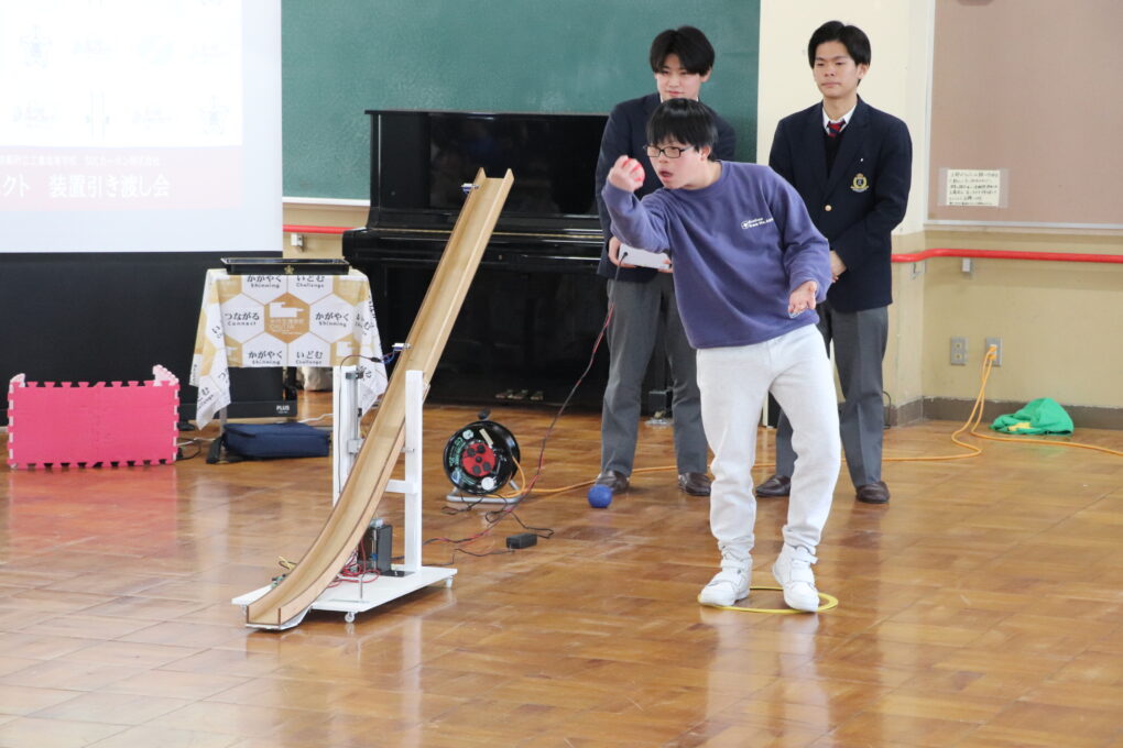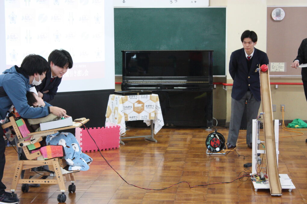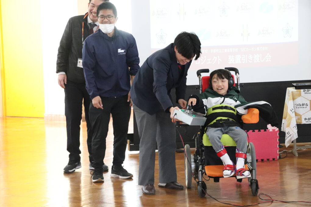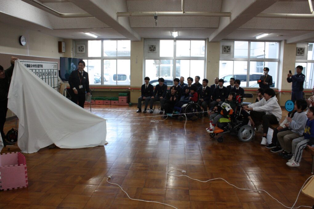 ついに、年度当初から進めてきた府立工業高等学校との共同プロジェクトで作成していた装置が完成を迎えました。肢体不自由の児童生徒のボッチャに対する意欲を高めることを目指し、工業高校の7名の生徒たちは今日まで奮闘してくれました。また、本プロジェクトを進めるに当たり予算を全面的に御支援いただいたSECカーボン株式会社の社員様もお招きし、御厚意に対し贈呈式を執り行い感謝状を本校校長より送りました。装置引き渡し会は、プロジェクトの対象となる児童生徒に加え、在籍学級全員が参加して行いました。参加した児童生徒たちは、除幕式後に披露した装置を目の当たりにし、想像を超える完成度に拍手を送っていました。工業高校の生徒による装置の操作説明を受け、いざ装置を使ったボッチャ交流へ。新装置を使ってのボッチャは新鮮そのものだったようで、完成を期待していた気持ちが溢れ、普段に増して主体的かつ意欲的にボッチャを楽しむことができました。また、SECカーボン株式会社の社員様や工業高校の教職員の方々も装置に触れ、その完成度を肌身で感じておられました。会も終盤、児童生徒を代表して中学部の生徒が、「すてきな装置と元気をくださってありがとうございました。これからはこの相棒(新装置)ともに、もっとボッチャを楽しみます。」と心込めて感謝を伝えました。1年間という長期間で取組を進める中で、装置の完成はもちろんですが、互いを知り思いやりをもって学べたことが何よりの成果でした。今回のこの出会いと経験は、インクルーシブな社会を目指す中で一歩前進したように感じる取組となりました。SECカーボン株式会社様、そして最後まで諦めず完成まで努力し続けてくださった工業高校の皆様、本当にありがとうございました。皆様との出会いに感謝をし、本校では今後もこの”相棒”を大切に扱い、ボッチャという競技を通して地域とつながりを深め、そして学びを深化させていきます。