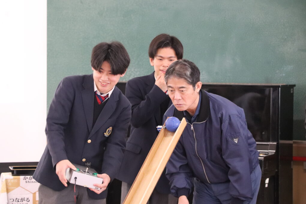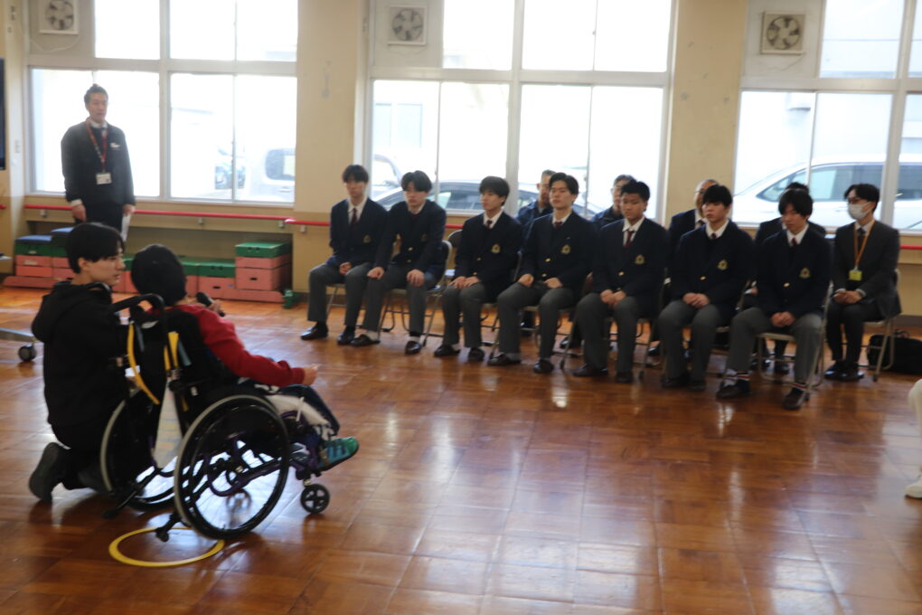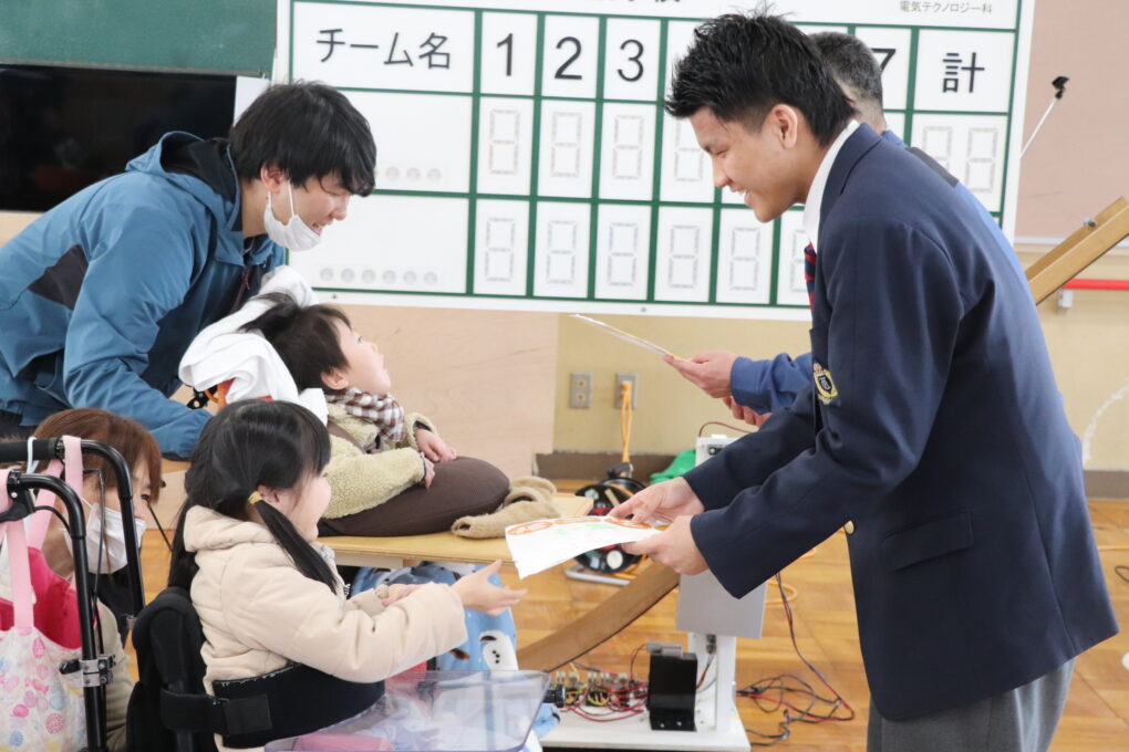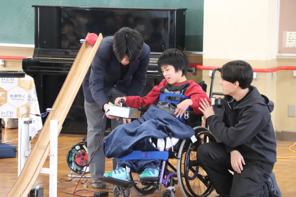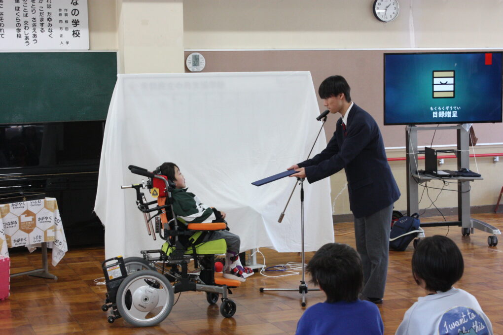 ついに、年度当初から進めてきた府立工業高等学校との共同プロジェクトで作成していた装置が完成を迎えました。肢体不自由の児童生徒のボッチャに対する意欲を高めることを目指し、工業高校の7名の生徒たちは今日まで奮闘してくれました。また、本プロジェクトを進めるに当たり予算を全面的に御支援いただいたSECカーボン株式会社の社員様もお招きし、御厚意に対し贈呈式を執り行い感謝状を本校校長より送りました。装置引き渡し会は、プロジェクトの対象となる児童生徒に加え、在籍学級全員が参加して行いました。参加した児童生徒たちは、除幕式後に披露した装置を目の当たりにし、想像を超える完成度に拍手を送っていました。工業高校の生徒による装置の操作説明を受け、いざ装置を使ったボッチャ交流へ。新装置を使ってのボッチャは新鮮そのものだったようで、完成を期待していた気持ちが溢れ、普段に増して主体的かつ意欲的にボッチャを楽しむことができました。また、SECカーボン株式会社の社員様や工業高校の教職員の方々も装置に触れ、その完成度を肌身で感じておられました。会も終盤、児童生徒を代表して中学部の生徒が、「すてきな装置と元気をくださってありがとうございました。これからはこの相棒(新装置)ともに、もっとボッチャを楽しみます。」と心込めて感謝を伝えました。1年間という長期間で取組を進める中で、装置の完成はもちろんですが、互いを知り思いやりをもって学べたことが何よりの成果でした。今回のこの出会いと経験は、インクルーシブな社会を目指す中で一歩前進したように感じる取組となりました。SECカーボン株式会社様、そして最後まで諦めず完成まで努力し続けてくださった工業高校の皆様、本当にありがとうございました。皆様との出会いに感謝をし、本校では今後もこの”相棒”を大切に扱い、ボッチャという競技を通して地域とつながりを深め、そして学びを深化させていきます。