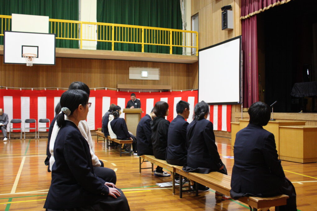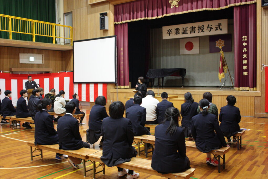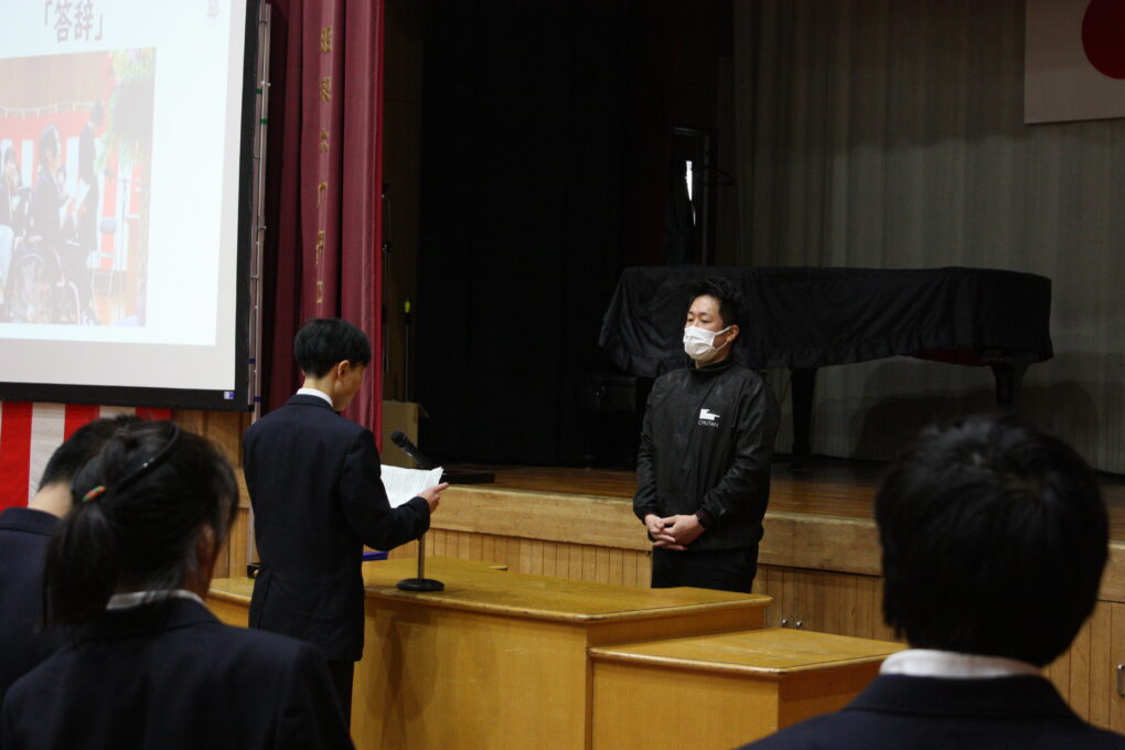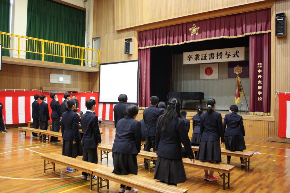 卒業式まで残すところあと3日。今日も卒業式の練習を行いました。連日の練習に、少しずつ生徒たちの表情にも凛々しさを感じられるようになってきました。昨日は本番を想定して校長先生から証書を受け取り、普段以上に背筋を伸ばして練習に臨み、目線を合わせることがポイントと講評をいただきました。昨日のポイントを生かし、今日は通し練習を行いました。当日に代表して答辞を述べる生徒の発表もあり、その生徒も心がこもった言葉として読めるよう練習に励んでいます。毎回、恒例のコーナーとして行っている先生からのメッセージでは、これまで「節目」「NO1とは」「思いを言葉に」「ありがとう」等、社会に巣立つ3年生の今後につながるメッセージが送られています。残り3日、明日はリハ―サルを予定しています。高等部一丸となって臨みましょう。
