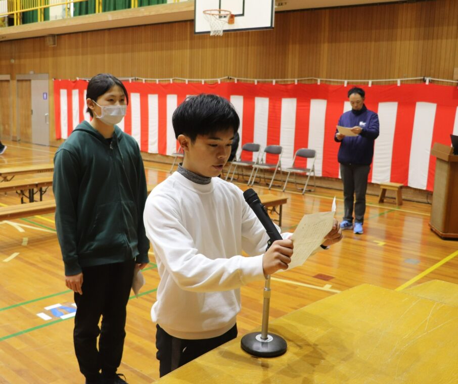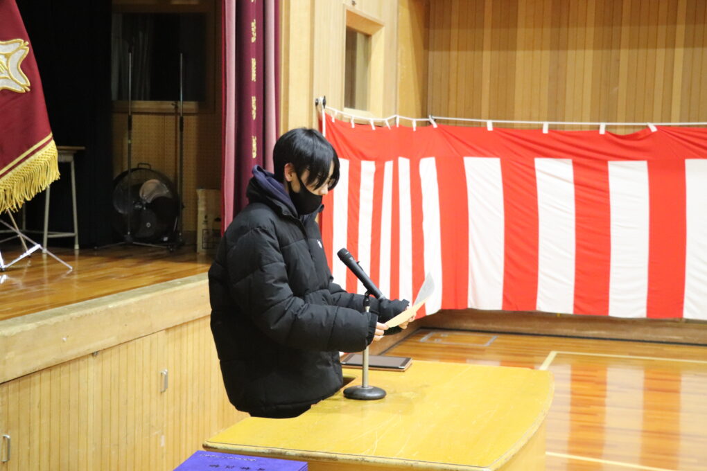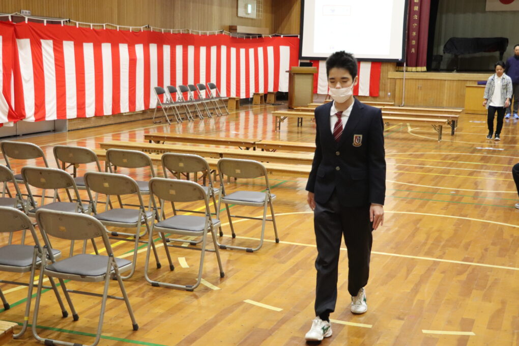 入退場では歩き始めるタイミング、送辞・答辞では話し方や礼のタイミング等に気を付けて練習に取り組みました。練習を積み重ねることで、目線が上がり姿勢が良くなり、背筋が伸びた堂々とした態度で取り組めるようになってきました。引き続き練習に取り組んでいきます。