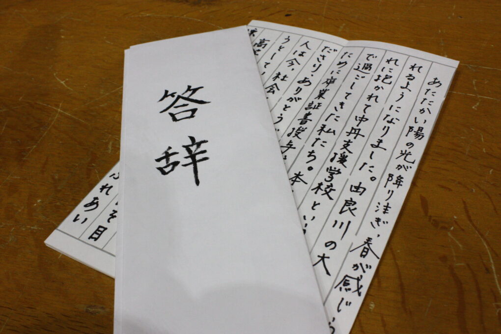 トピックス・News記事明日は、高等部18名が行う最後の授業「卒業証書授与式」です。今日の最後の練習後、長内総括より「この後、お世話になった先生に感謝の思いを伝えに行きましょう。」と指示を受け、生徒たちは以前担任をしてもらった先生たちに感謝の思いを言葉で伝えていました。放課後は、指導者で思いを込めて会場の準備を行いました。3年生のみなさん。明日は、慣れ親しんだバスに乗り胸を張って晴れやかな表情で登校してくれること先生たちは楽しみに待っています!みんなで心に残る卒業式にしましょう!