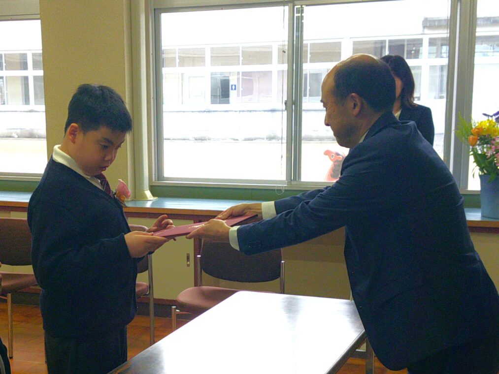 本日、先週の式に欠席した児童の卒業証書授与式を執り行いました。保護者の方や担任等が見守る中、卒業生は中学部の真新しい制服に身を包み、良い表情で卒業証書を受け取りました。