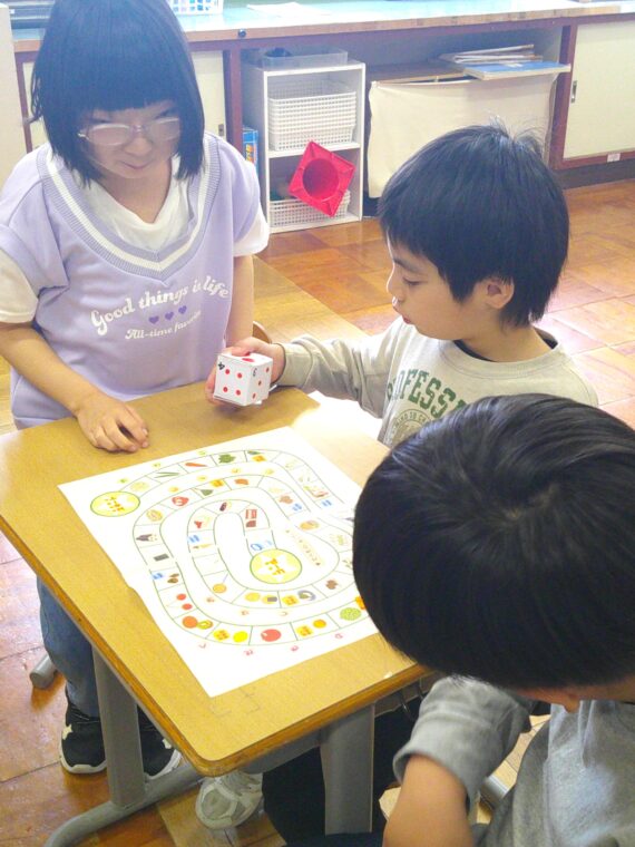 トピックス・News記事小学部高学年は、グループに分かれて国語や自立活動を行いました。国語を行ったグループでは、自己紹介をしたり、友達とすごろくをしたりしました。自己紹介では「どんなハンバーグが好き?」などと友達に質問したり、すごろくでは進んだ先のマスを見て、「かぼちゃだ!食べるのはそんなにやけど…。」など話したりしながら、児童達は意欲的に取り組んでいました。