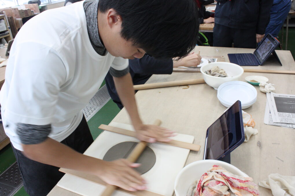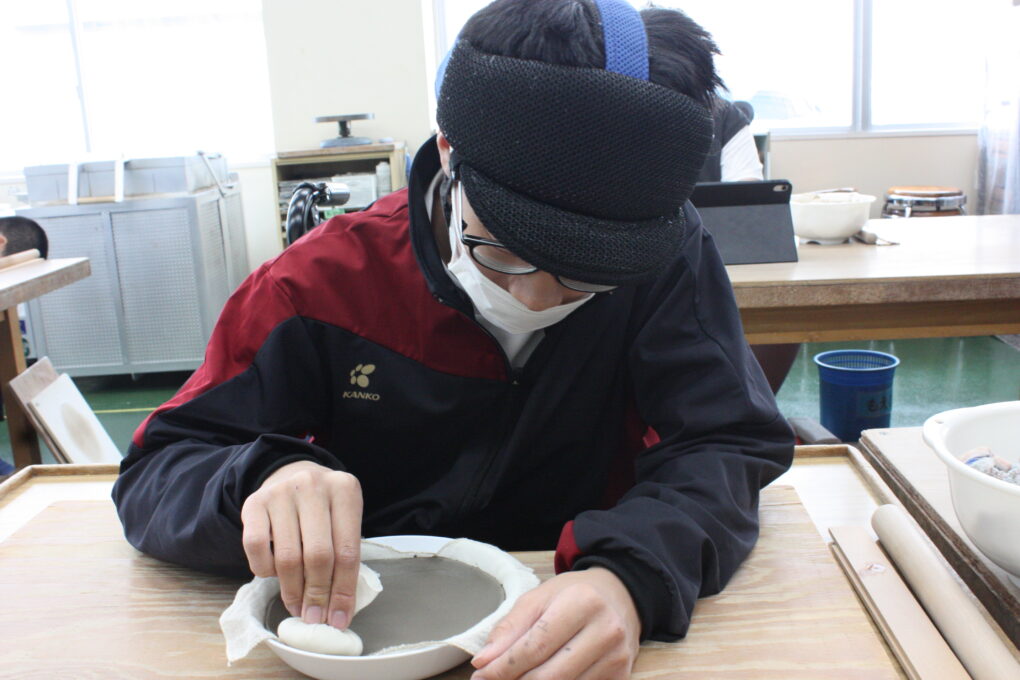 トピックス・News記事今年度高等部5、6組の作業学習は、さをり織りと窯業の班に分かれて行っています。さをり織りは、専用の織り機を使い丁寧に糸を通しストラップや織布等を制作しています。窯業は、昨年販売会で大好評をいただいた野菜小皿を中心に小皿の制作を行っています。1年生も、少しでも早く工程を覚えようと指導者に尋ね、意欲的に作業に取り組んでいます。回を重ねるごとに手付きがよくなってきています。今後、どのような製品に仕上がるか楽しみですね。