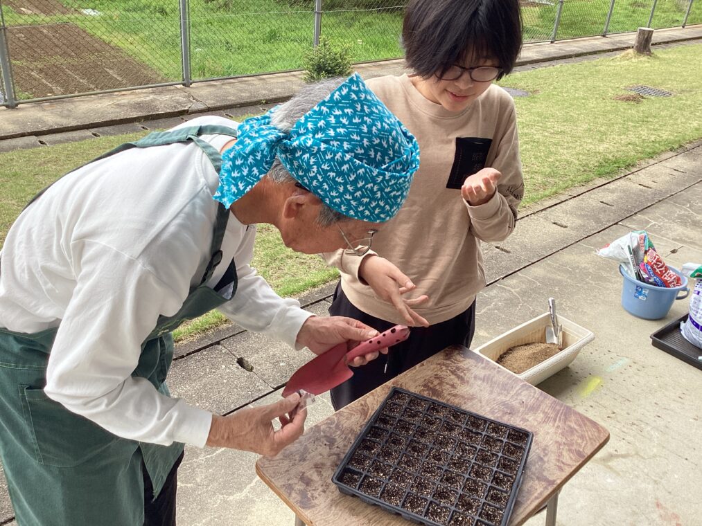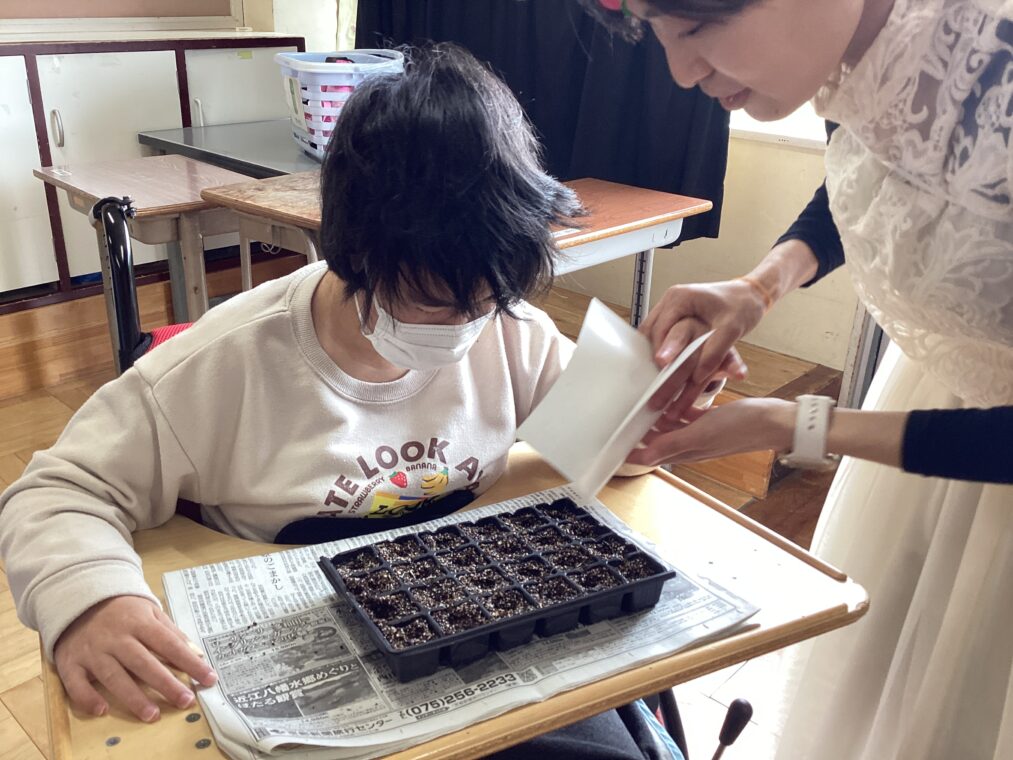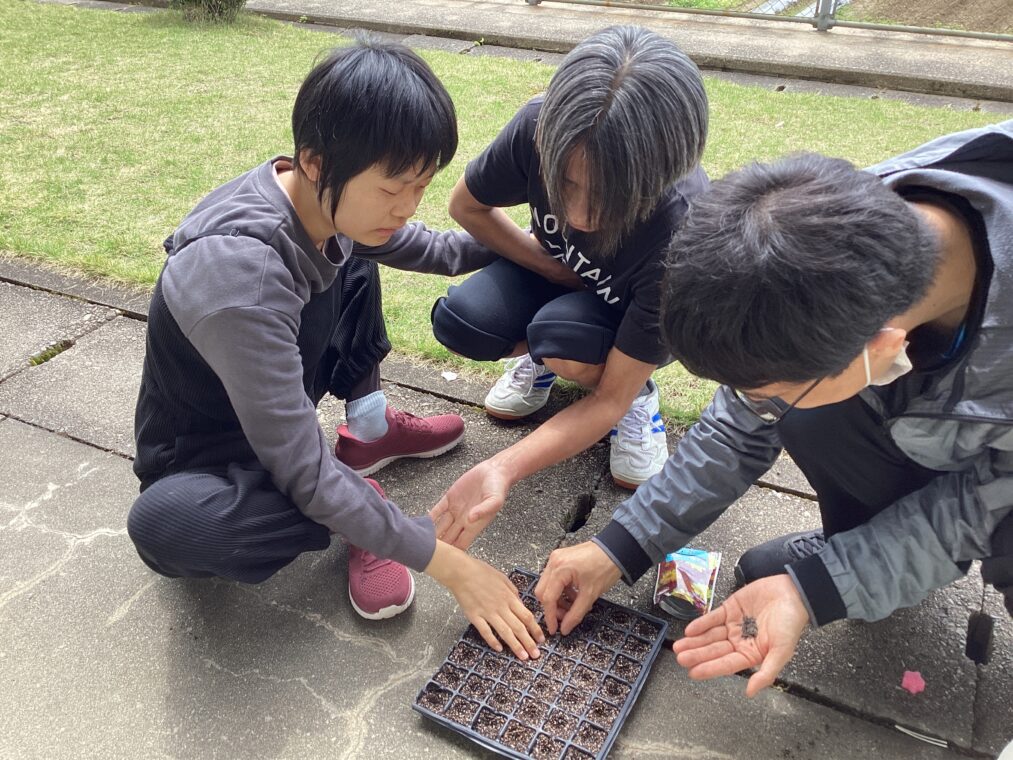 トピックス・News記事高等部1、2組の生活単元学習では、「野菜と花の時間」という単元で野菜や花等の植物を育てる学習を行っています。本時の導入では、花や野菜に詳しい「フラワーちゃん」と「ガーデンさん」が登場し、生徒達の意欲を高めながら、土を耕し、花の種を植えました。訪問生もリモートで学習に参加し、説明を受けた後、自宅で花の種を植えました。今後も、立派に育つよう定期的に水やりや観察等を行っていきましょう!