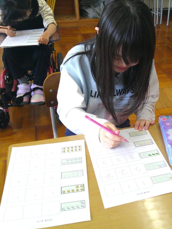 トピックス・News記事小学部高学年は、グループに分かれて算数や自立活動を行いました。算数を行ったグループでは、数の表し方や数の大小について学びました。数字を書く際には、丁寧に書くよう心掛けたり、大小を比べる際には、「4個…いや5個かな。」と○が何個多いかを見比べながら考えたりすることができました。