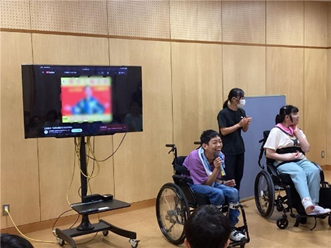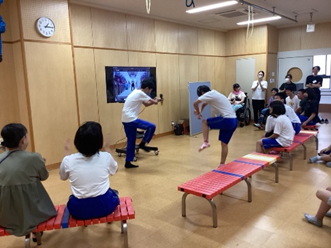 宇治支援学校では、学部や学年を越えて児童生徒同士の関わりを深めるために、昼休みに『交流』の時間を設けています。10月もみんなが楽しみにしている「カラオケ大会」を開催しました。給食を食べ終えると、プレイルームには全校の児童生徒が笑顔で集まり、活動に慣れてきて積極的に手をあげる人が増えました。