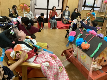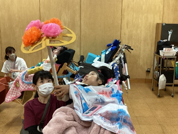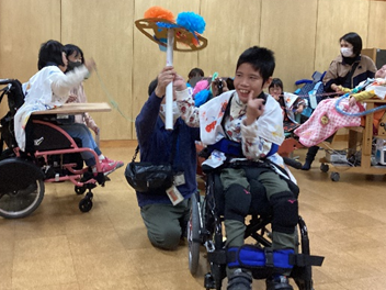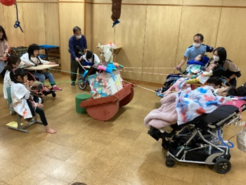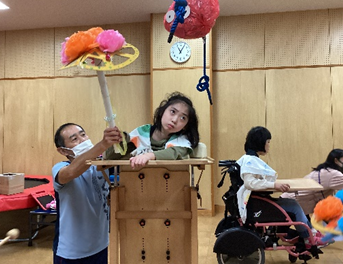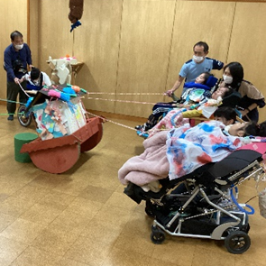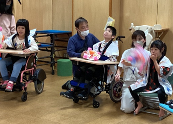 小学部5・6年1組、5・6年2組、訪問1組では、「みんなでえん‐JOY」の単元で「みんなでお祭り~秋わっしょい!~」と題して“お祭り”をテーマにした学習に取り組んでいます。本学習では、国語科の「言葉のもつ音やリズムに触れたり、表情や気持ちを表す言葉に親しんだりすることができる。」ことや、生活科の「楽器の演奏やお神輿引き、花笠持ち等の役割が分かり、取り組もうとすることができる。」こと等をねらいとして取り組んでいます。「あきやさいのあきわっしょい」という絵本の中にある「わっしょいも!」や「やーっさい!」という掛け声の響きに馴染んだり、お神輿引きや花笠の文化に親しんだりして取り組んでいます。回数を重ねるごとにそれぞれの役割を自分達で分かって、お神輿を引き合ったり、音楽に合わせて花笠を揺らしたりして、自分なりに表現することができた子ども達です。