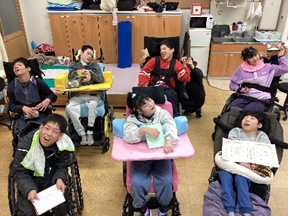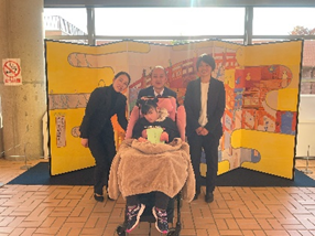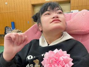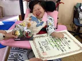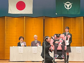 壇上では、スポットライトを浴びながら宇治市長から賞状を受け取ったり、VOCAを使ってインタビューに応えたりと、堂々とした態度で臨むことができました。たくさんの方々から「おめでとうございます」とお祝いの言葉をかけていただくと、笑顔で手を動かして、嬉しい気持ちを伝えていました。貴重な経験をすることができ、とても充実した表情を見せていました。