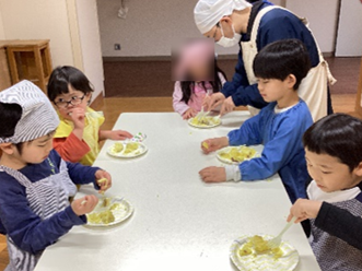 そしてついに、5月に植えたさつまいもが長い生育期間を経て大きく生長し、収穫の秋を迎えました。絵本を読んでつるを引っ張る練習もばっちりです!「うんとこしょどっこいしょ」の掛け声に合わせて、力いっぱい引っ張る子ども達。たくさんのさつまいもを収穫することができました。収穫した野菜で調理を行い、「自分達で育てた!」という達成感を感じる実りある機会となりました。