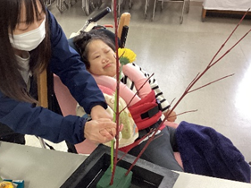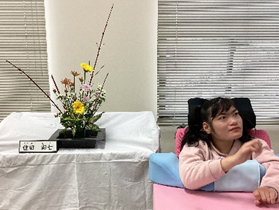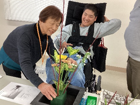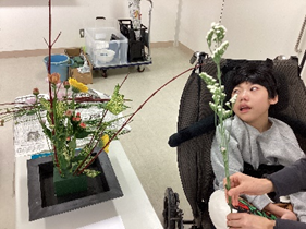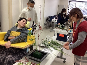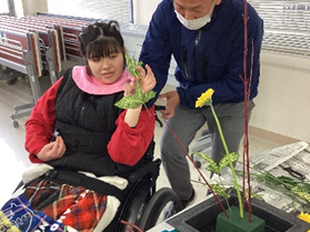 12月12日(金)に、高等部くらし健康コースが「学校・いけばな・出会いプロジェクト」で、東福寺未生流の井田益甫先生を講師にお招きし、生け花の体験学習を行いました。この学習は、地域で活動されている方との交流をとおして、華道の文化に親しむことをねらいとして取り組みました。
