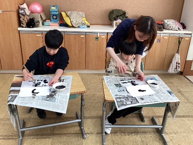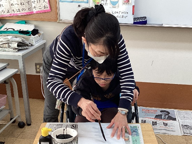 児童達は、書き初めや凧作り、お正月にちなんだ工作等の活動をとおして、主体的に、のびのびと学習に参加しています。書き初めの学習後には、これまで以上に丁寧な姿勢を意識して文字を書こうとする児童の姿が見られるようになりました。