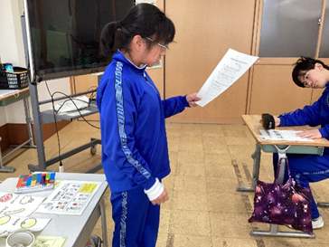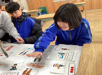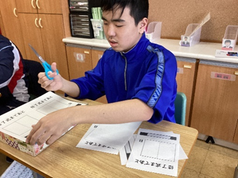 中学部2年生の総合的な学習の時間「仕事について知ろう」では、グループに分かれて進路学習に取り組んでいます。絵合わせゲームやタブレット端末を用いた学習をとおして世の中の様々な仕事の名前や内容について知ったり、校内の職員へのインタビューや実際の仕事を体験したりすることで、仕事や働くことについての理解を深めています。この単元での学習が自分の将来のことを考えたり、仕事への意欲ややりがいを感じたりするきっかけになればと思います。